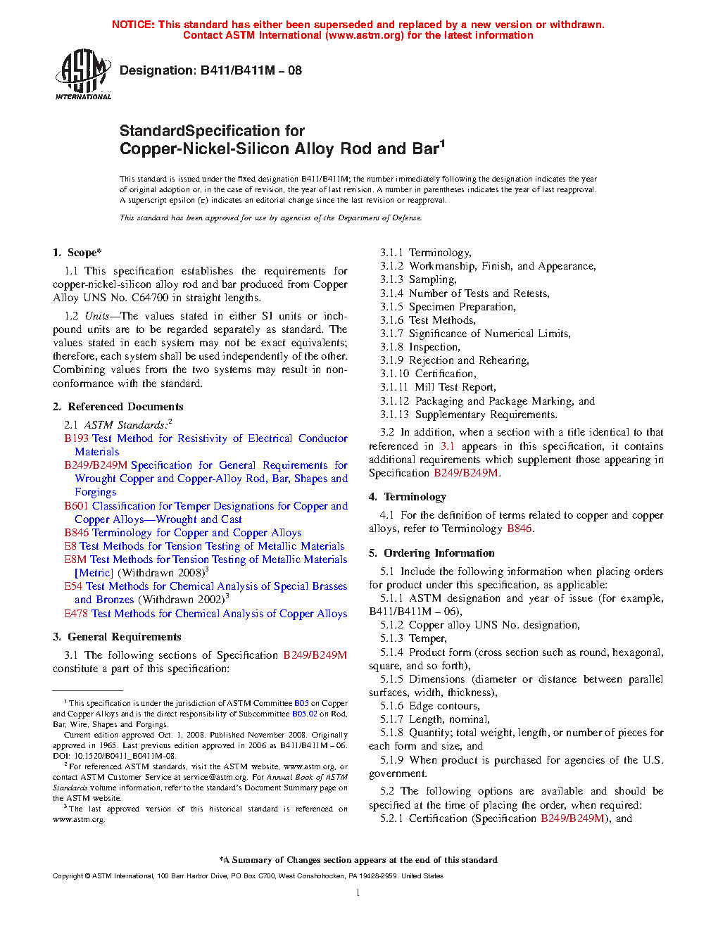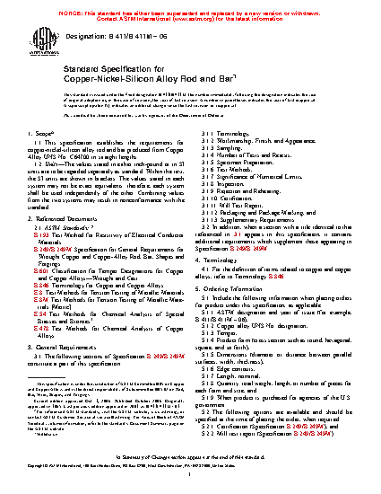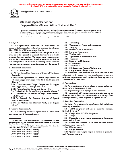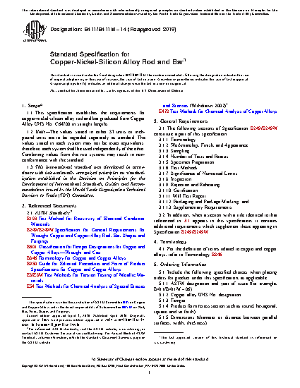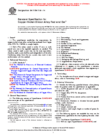 1.1 This specification establishes the requirements for copper-nickel-silicon alloy rod and bar produced from Copper Alloy UNS No. C64700 in straight lengths.
