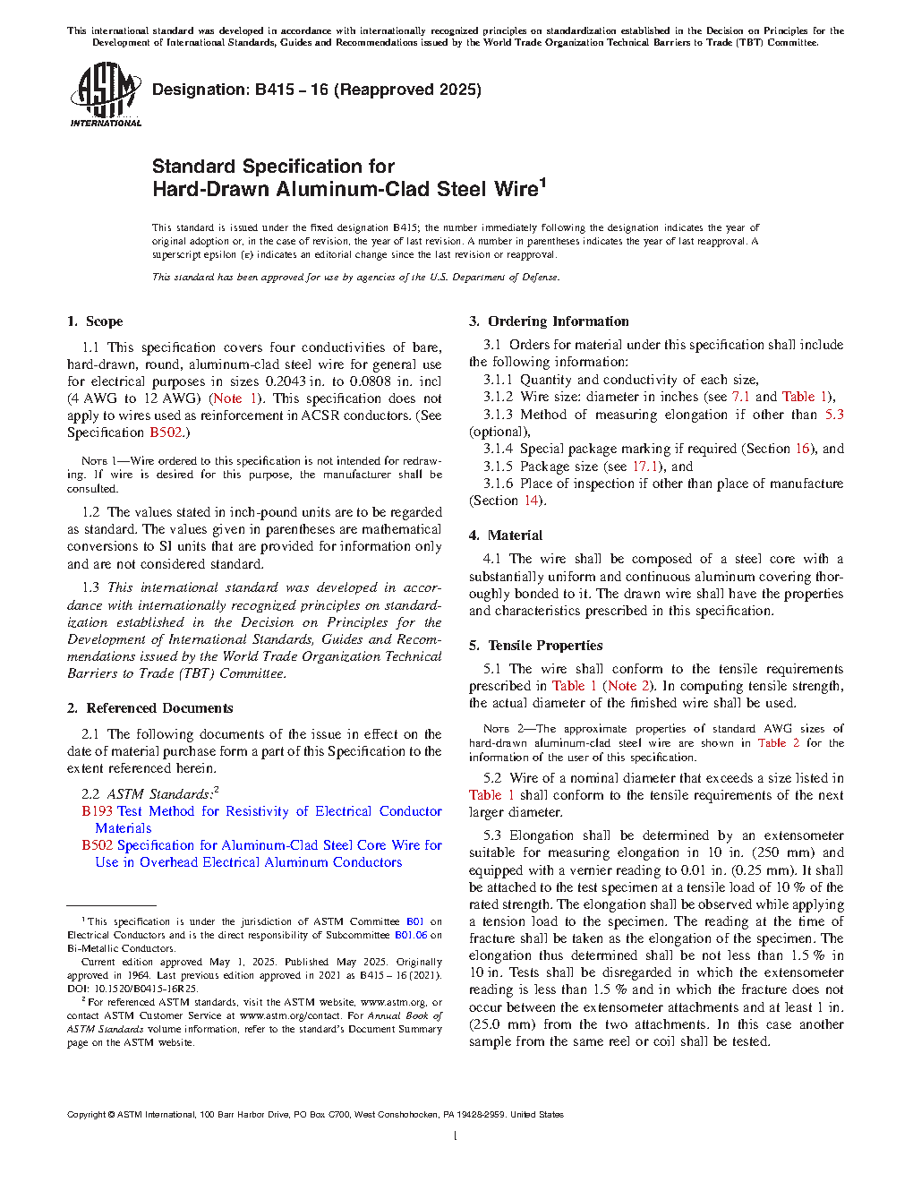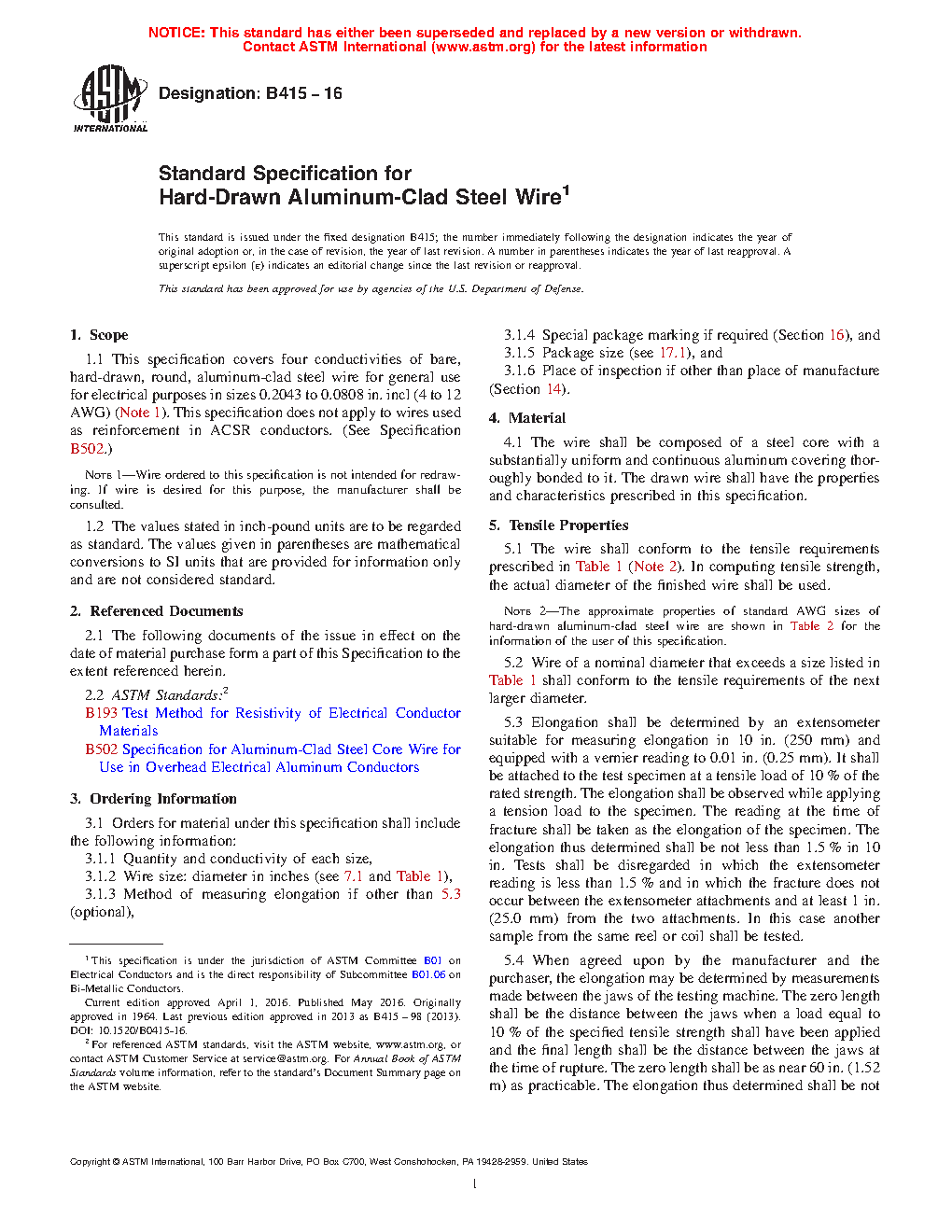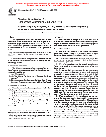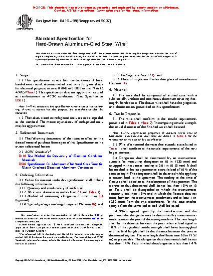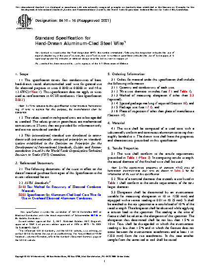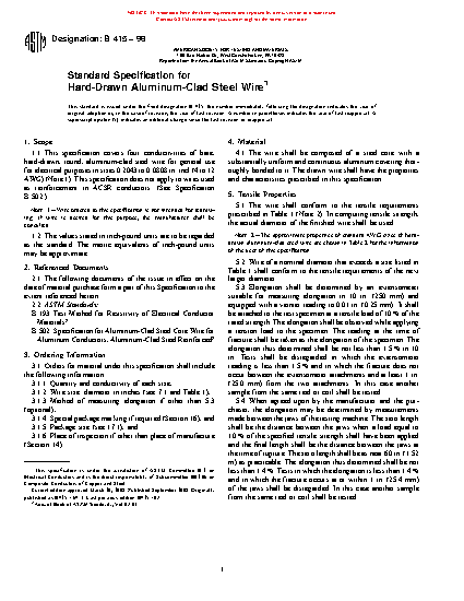 This specification covers four conductivities of bare, hard-drawn, round, aluminum-clad steel wire for general use for electrical purposes. The wire shall be composed of a steel core with a substantially uniform and continuous aluminum covering thoroughly bonded to it. The drawn wire shall have the properties and characteristics prescribed in the specification. The wire of varying nominal diameters shall conform to the prescribed tensile requirements such as tensile strength and elongation. The electrical resistance of the wire shall be determined by resistance measurements and maximum resistance shall be based on the nominal diameter of the wire and the resistivity value. The steel wire shall conform to the prescribed values of physical constants such as modulus of elasticity, coefficient of linear expansion, and temperature coefficient of resistance. Within a required range of diameters, the wire shall not vary from the specified diameter by more than the amount indicated. The aluminum thickness at any point shall not be less than the required values. The wire shall undergo a twist test, where the specimen shall be gripped at its ends in vises, one of which shall be free to move longitudinally during the test. The finished wire shall contain no joints or splices. The material shall also conform to the approximate properties of hard-drawn conductivity aluminum-clad steel wire.