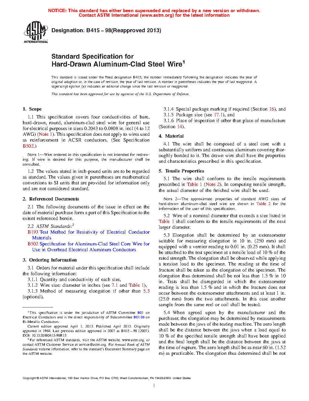 1.1 This specification covers four conductivities of bare, hard-drawn, round, aluminum-clad steel wire for general use for electrical purposes in sizes 0.2043 in. to 0.0808 in. incl (4 AWG to 12 AWG) (Note 1). This specification does not apply to wires used as reinforcement in ACSR conductors. (See Specification B502.)
