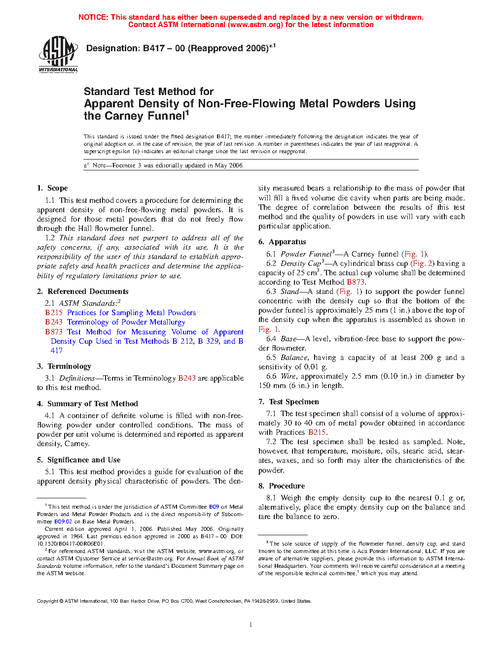 1.1 This test method covers a procedure for determining the apparent density of non-free-flowing metal powders. It is designed for those metal powders that do not freely flow through the Hall flowmeter funnel.