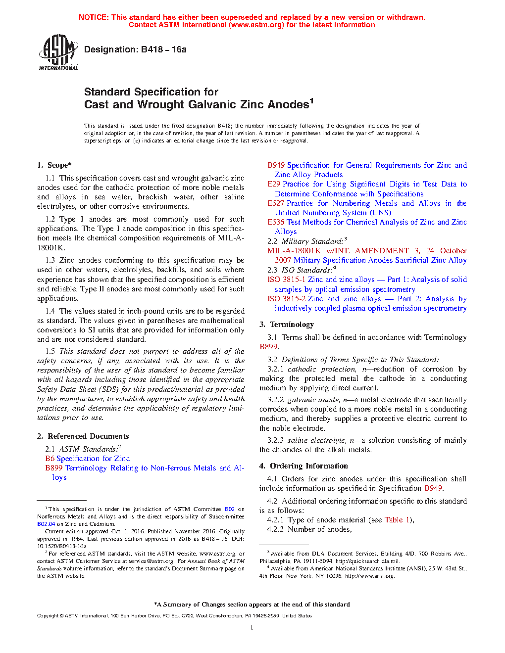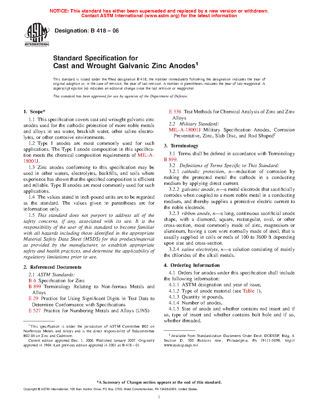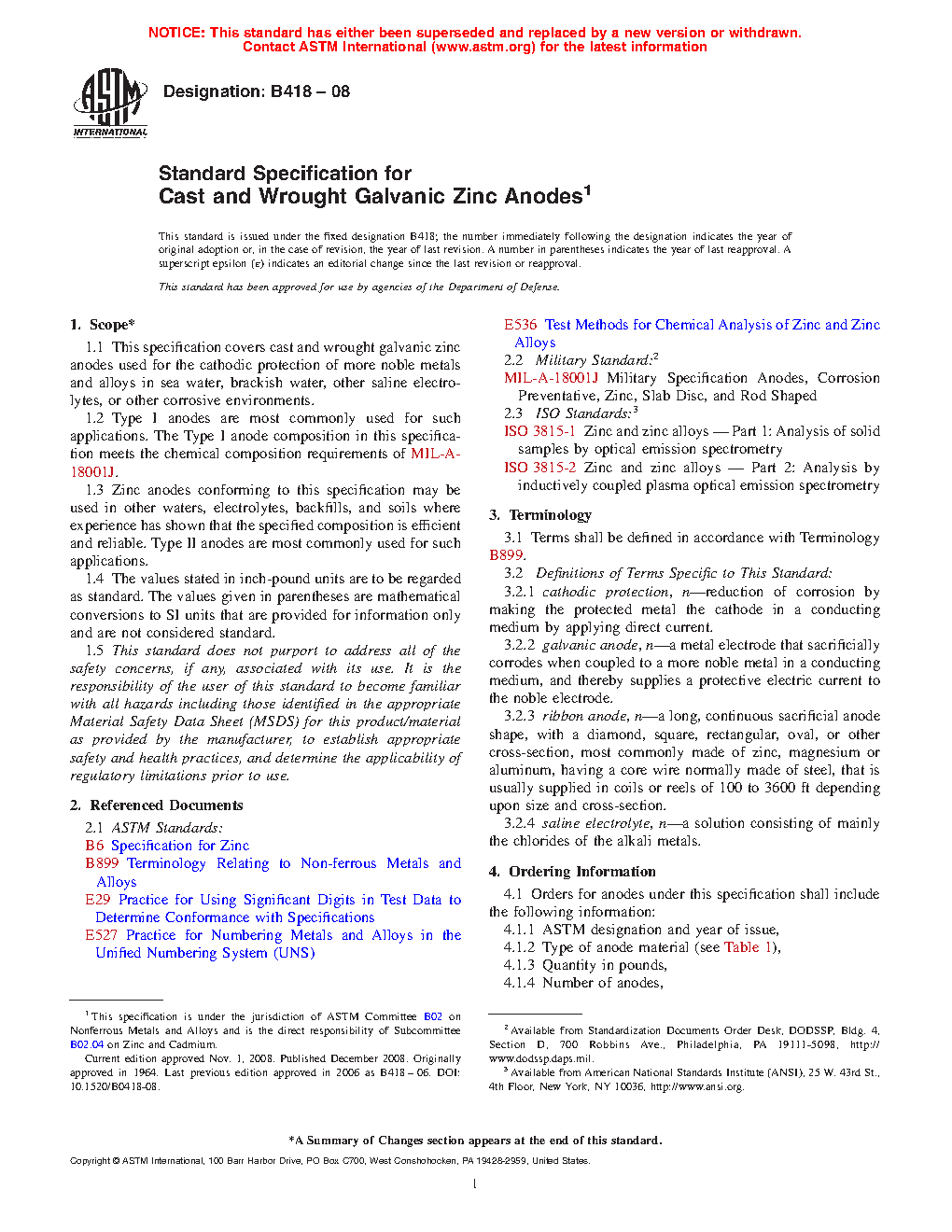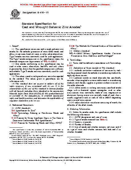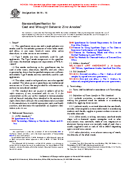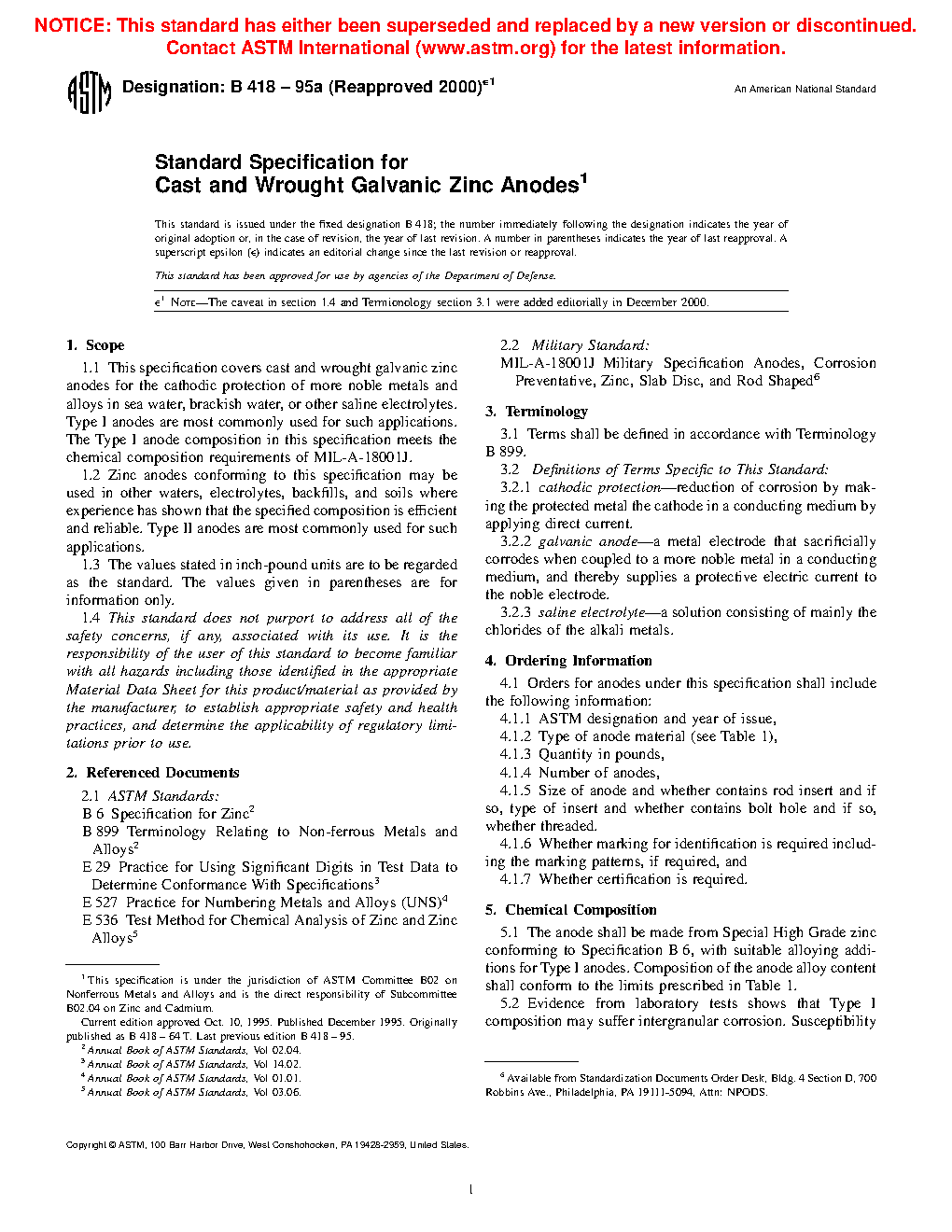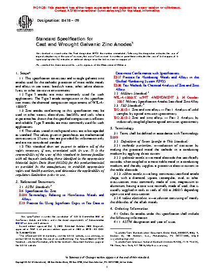 1.2 Type I anodes are most commonly used for such applications. The Type I anode composition in this specification meets the chemical composition requirements of MIL-A-18001K.