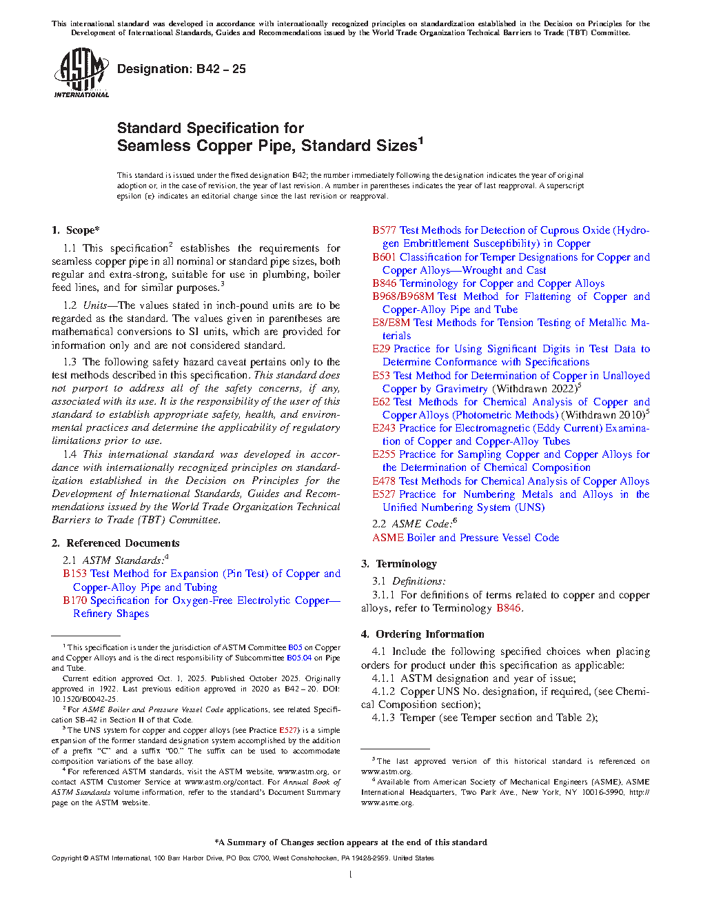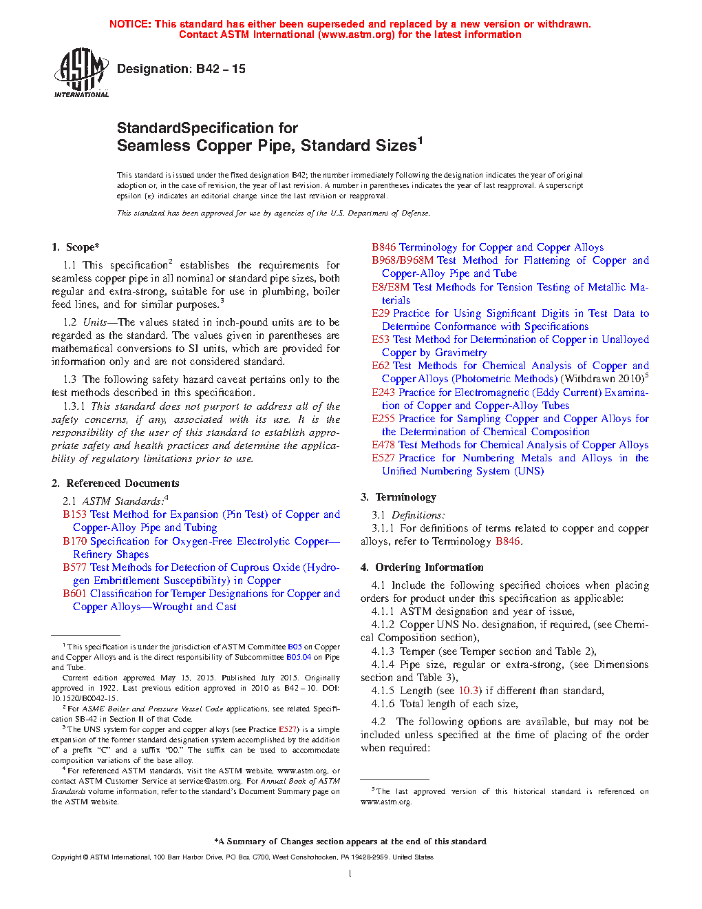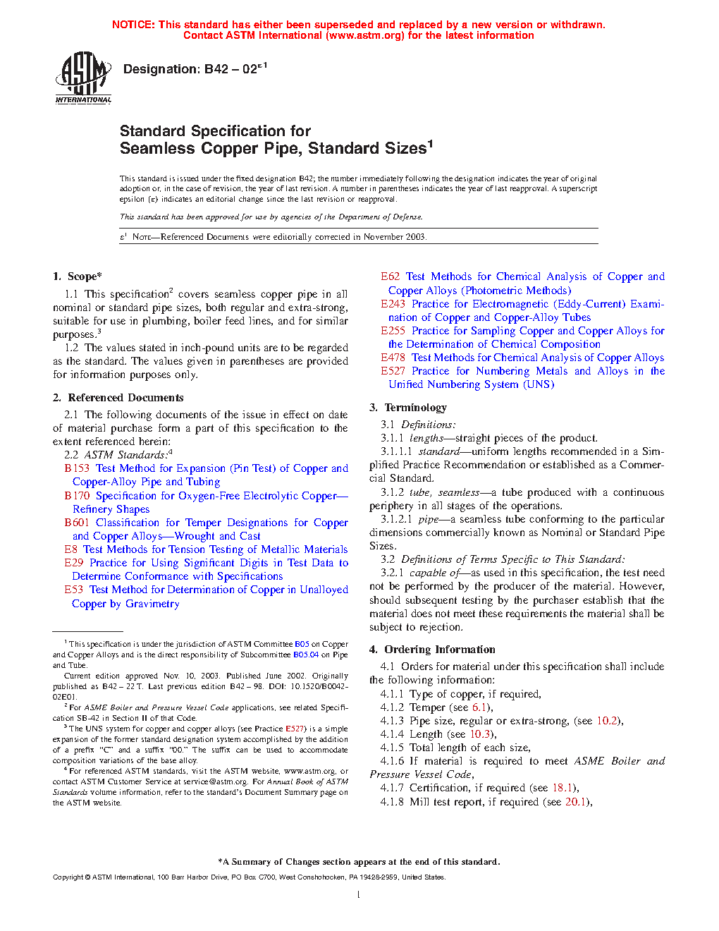 1.1 This specification2 establishes the requirements for seamless copper pipe in all nominal or standard pipe sizes, both regular and extra-strong, suitable for use in plumbing, boiler feed lines, and for similar purposes.3