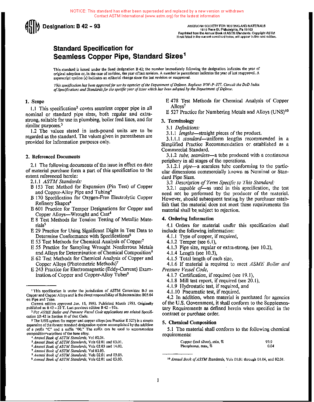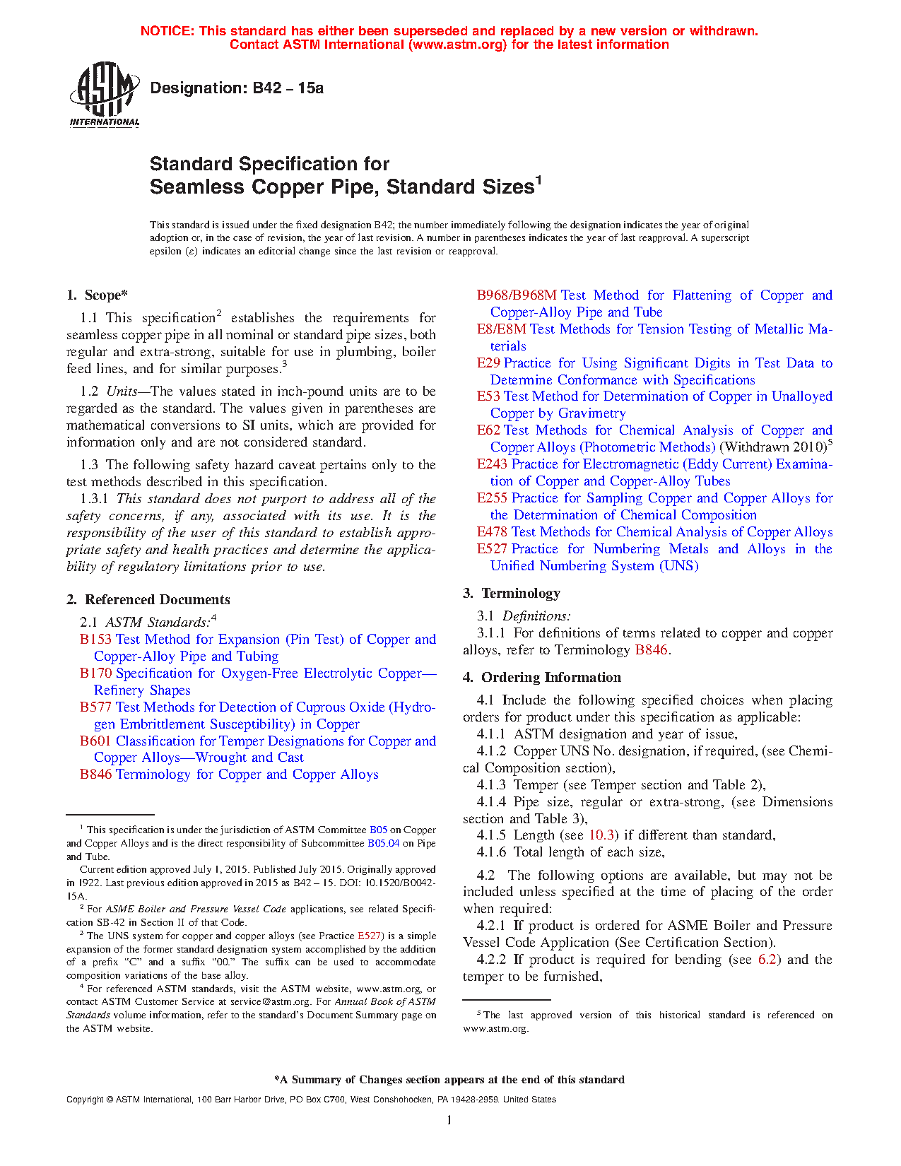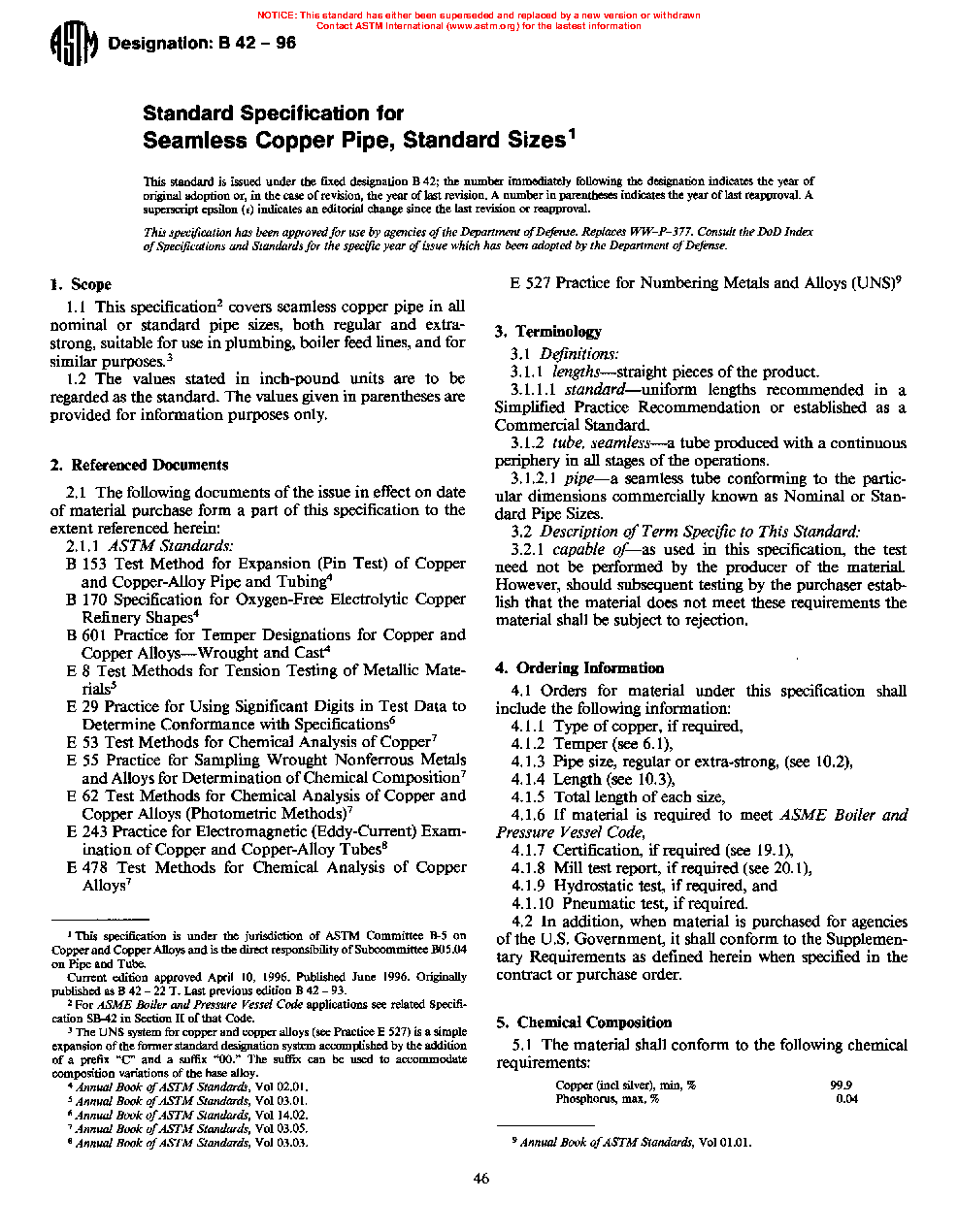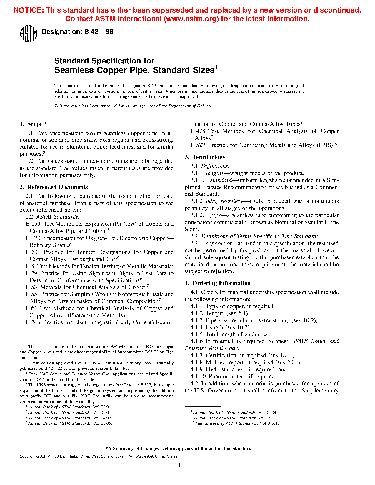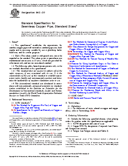 1.1 This specification2 establishes the requirements for seamless copper pipe in all nominal or standard pipe sizes, both regular and extra-strong, suitable for use in plumbing, boiler feed lines, and for similar purposes.3