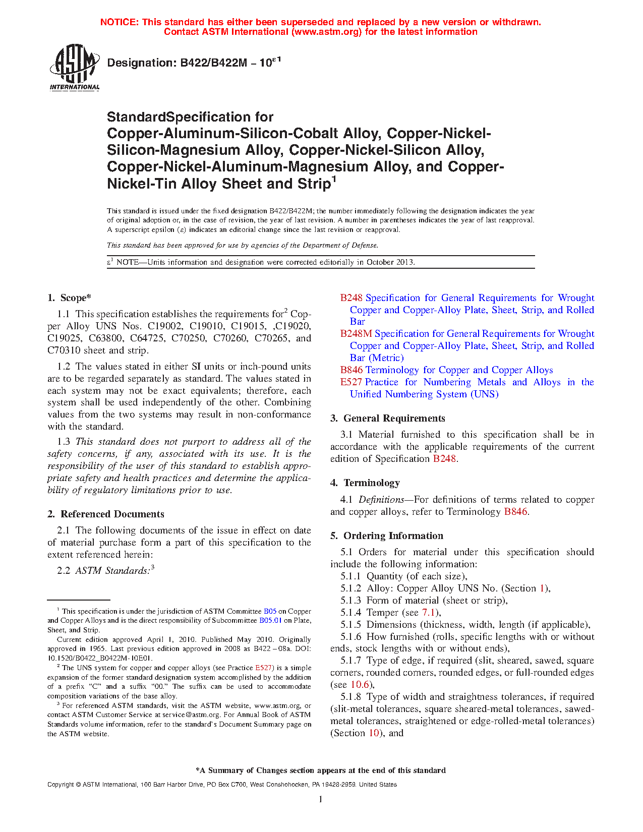 1.1 This specification establishes the requirements for2 Copper Alloy UNS Nos. C19002, C19010, C19015, C19020, C19025, C63800, C64725, C70250, C70260, C70265, C70310, and C70350 sheet and strip.