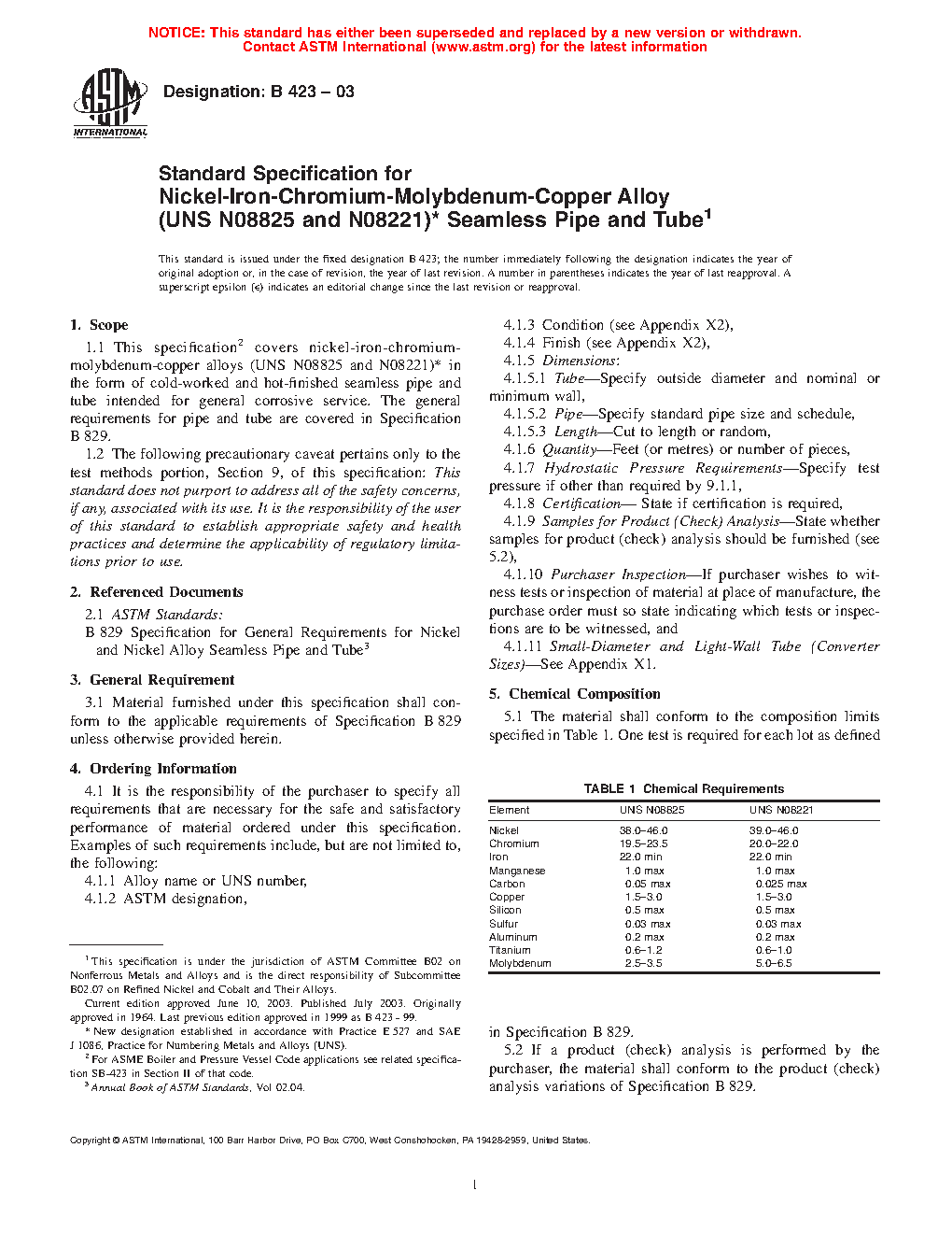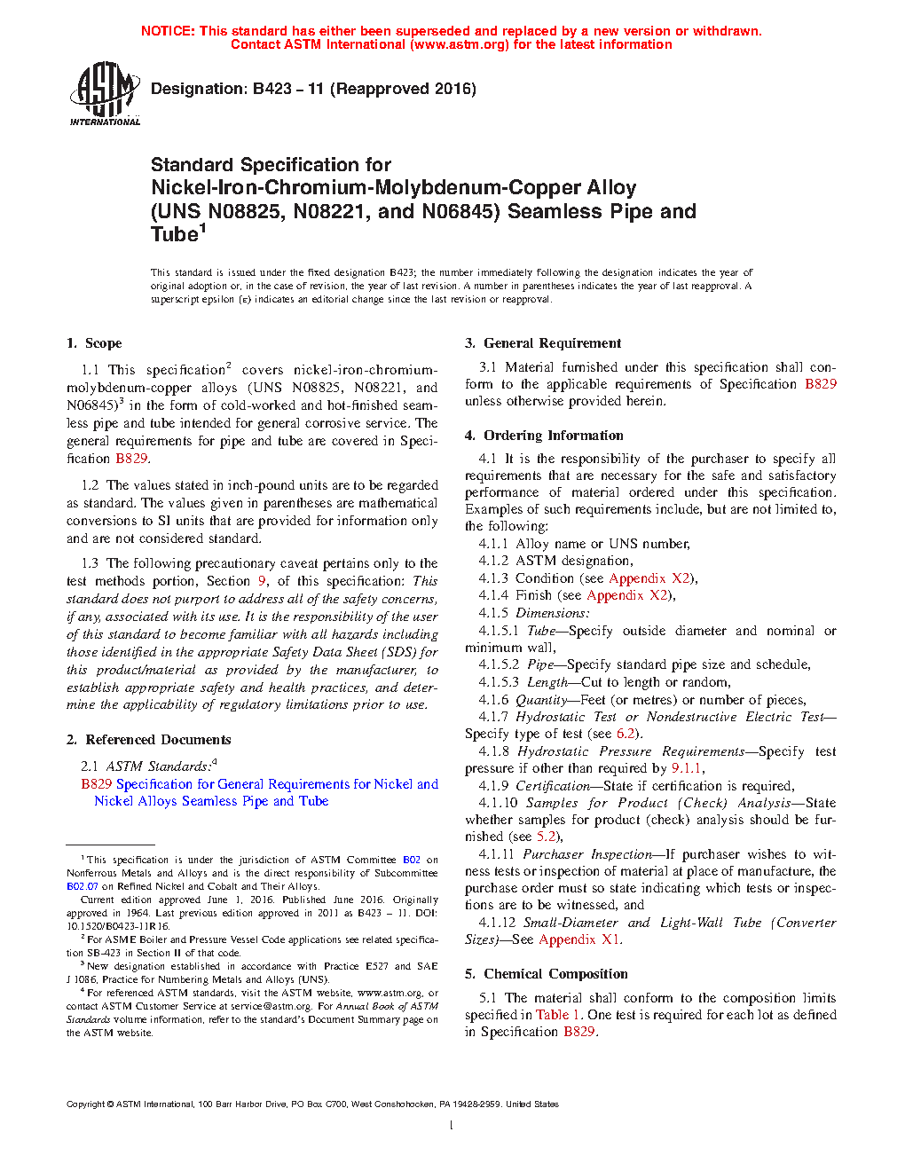 1.1 This specification2 covers nickel-iron-chromium-molybdenum-copper alloys3 in the form of cold-worked and hot-finished seamless pipe and tube intended for general corrosive service. The general requirements for pipe and tube are covered in Specification B829.