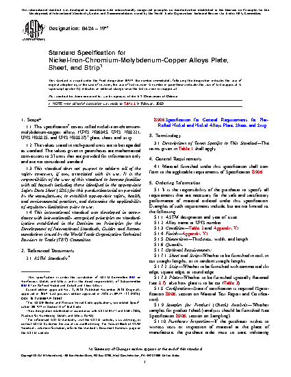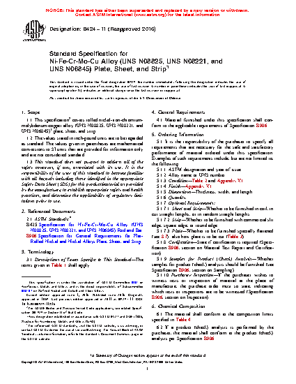 1.1 This specification2 covers rolled nickel-iron-chromium-molybdenum-copper alloys (UNS N08642, UNS N06845, UNS N08221, UNS N08825, and UNS N08827) plate, sheet, and strip.