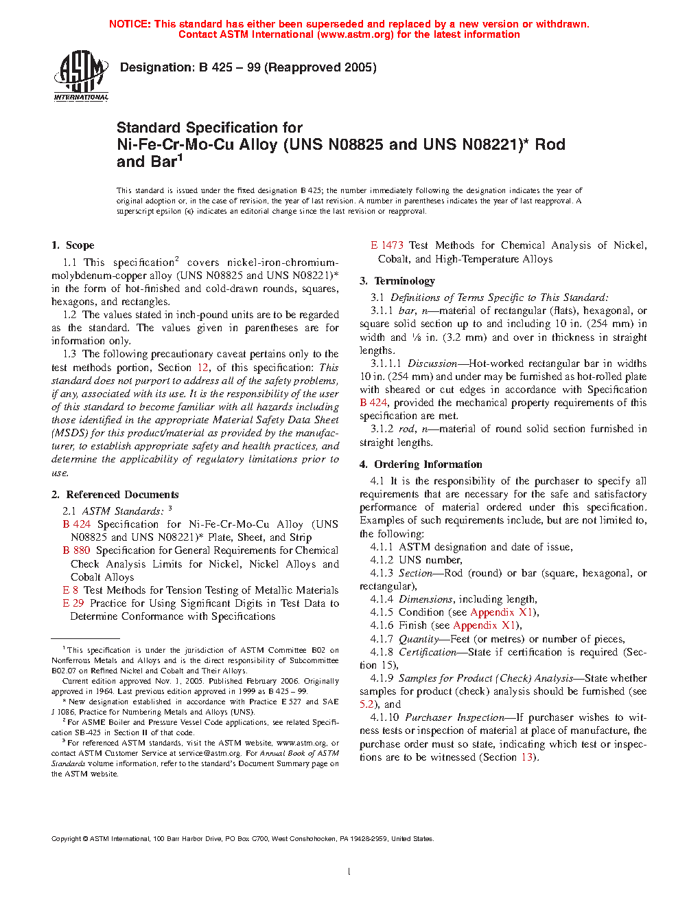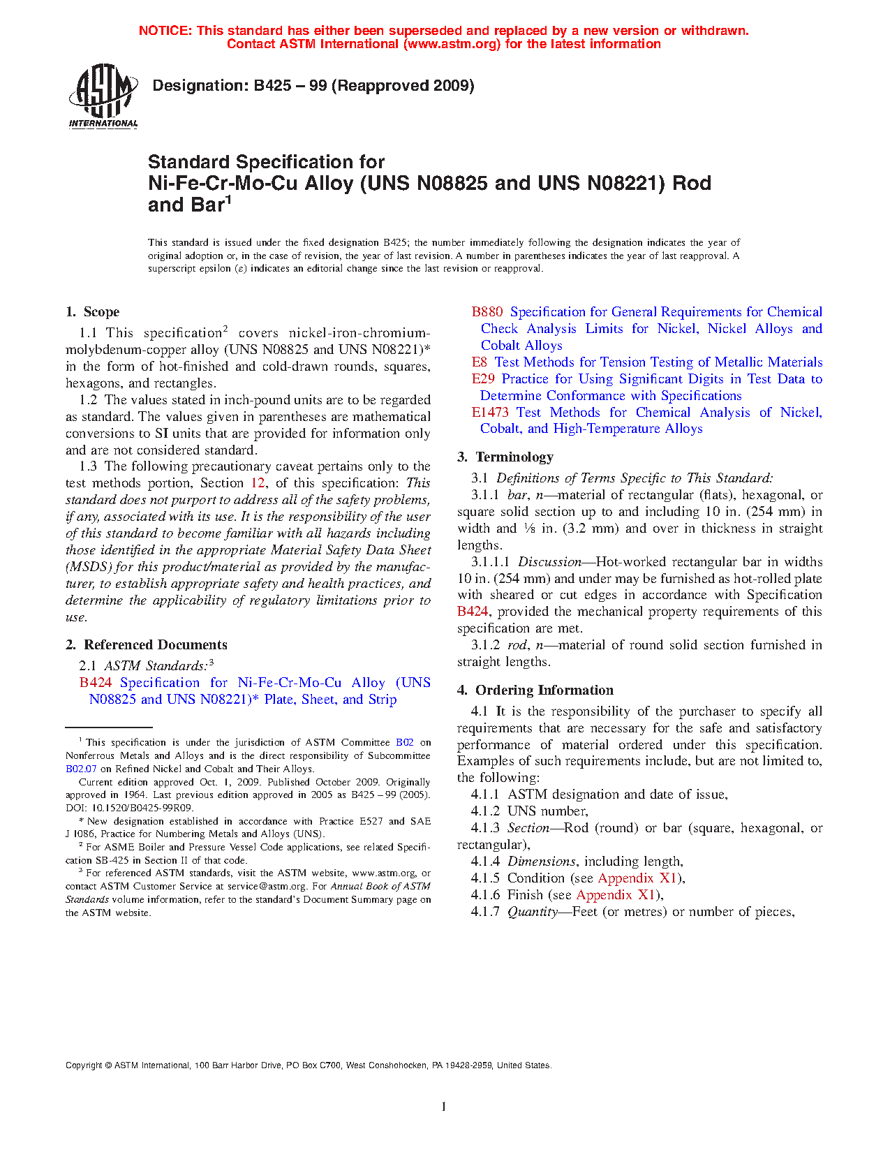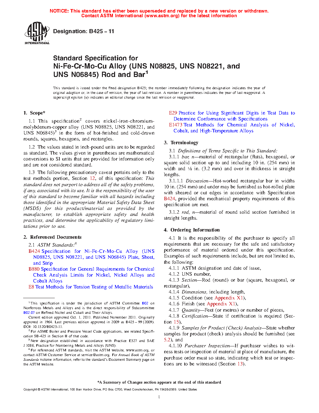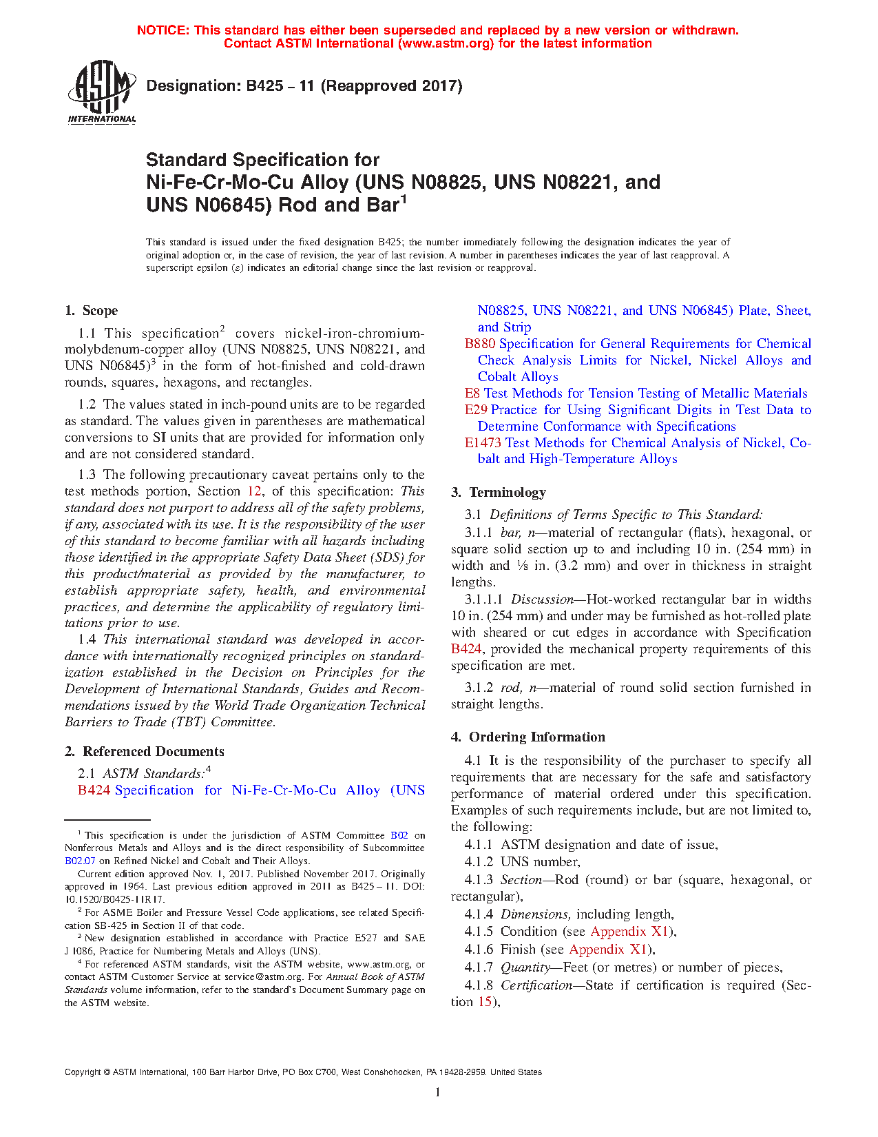1.1 This specification2 covers nickel-iron-chromium-molybdenum-copper alloys (UNS N06845, UNS N08221, UNS N08825, and UNS N08827)3 in the form of hot-finished and cold-drawn rounds, squares, hexagons, and rectangles.