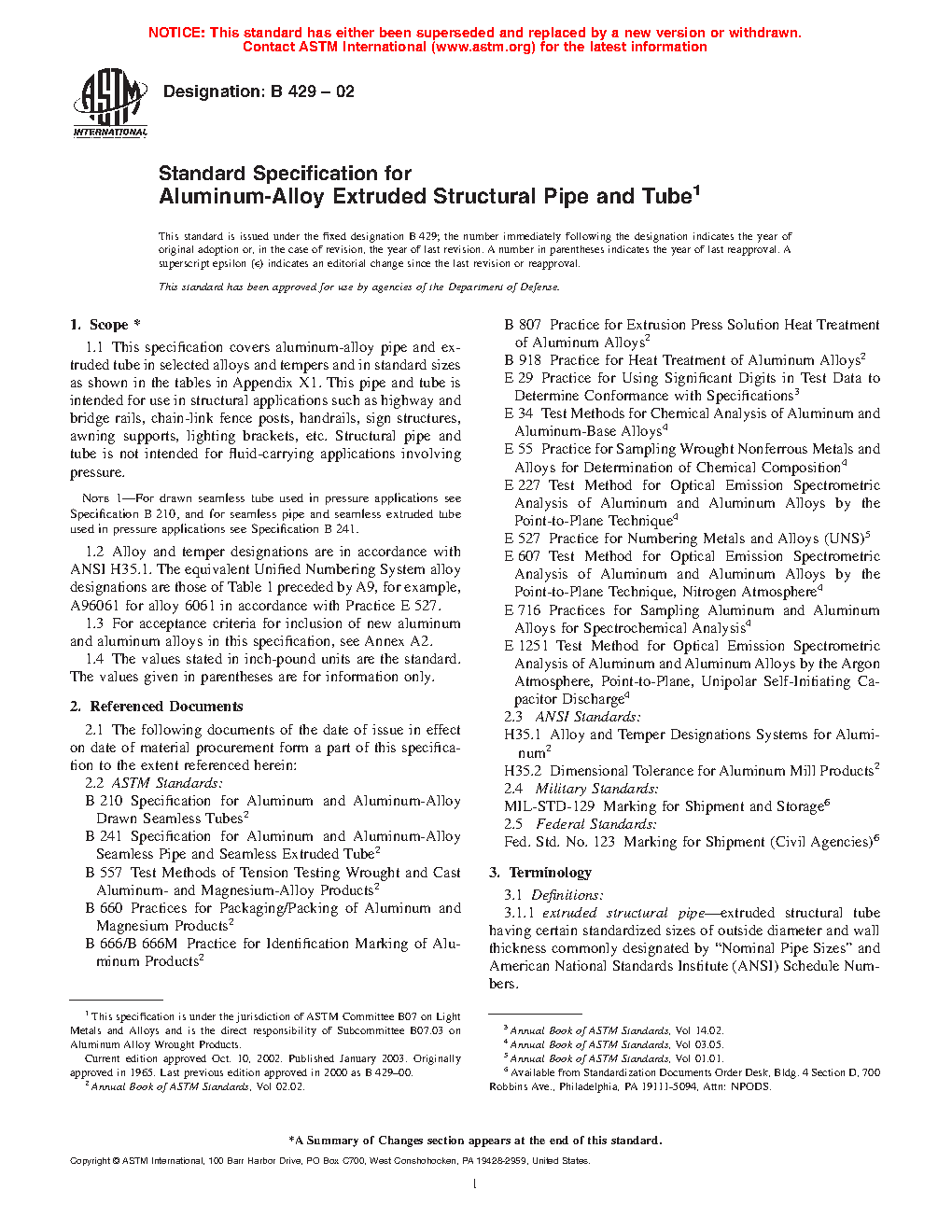 This specification covers UNS A96061 or A96063 aluminum alloy extruded pipes and tubes intended for use in structural applications. The structural pipes and tubes that may be produced through a bridge/porthole type die or other approved methods are not for use in fluid-carrying applications involving pressure. Both alloys may be extrusion press solution heat treated to produce the specified tempers. Each pipe or tube should be supplied with plain square-cut ends and mill finished unless otherwise specified. Samples for chemical analysis should be taken from the materials by drilling, sawing, turning, or clipping and subjected to suitable chemical or spectrochemical methods of analysis.