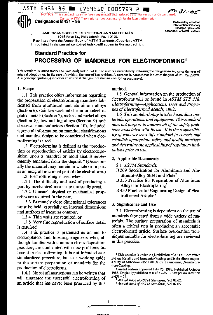 Practice for Processing of Mandrels for Electroforming (Withdrawn 1993)