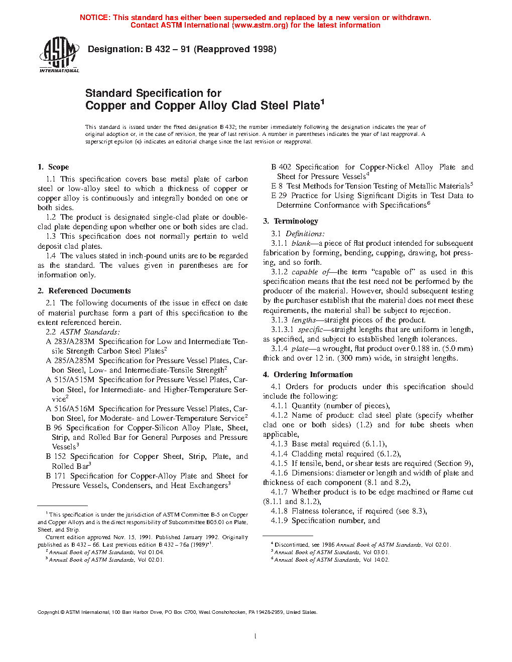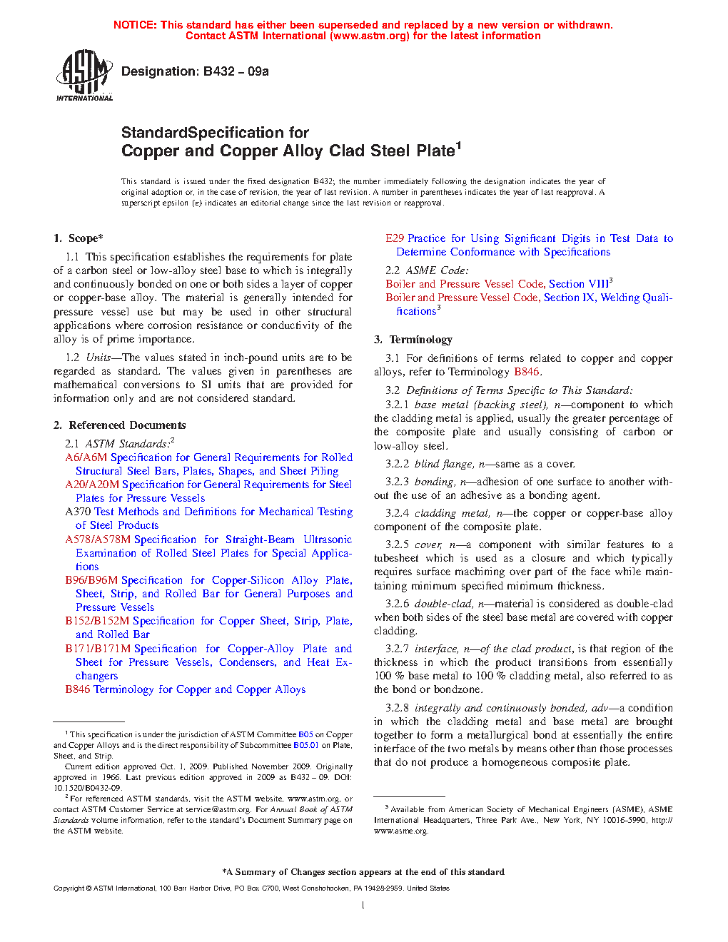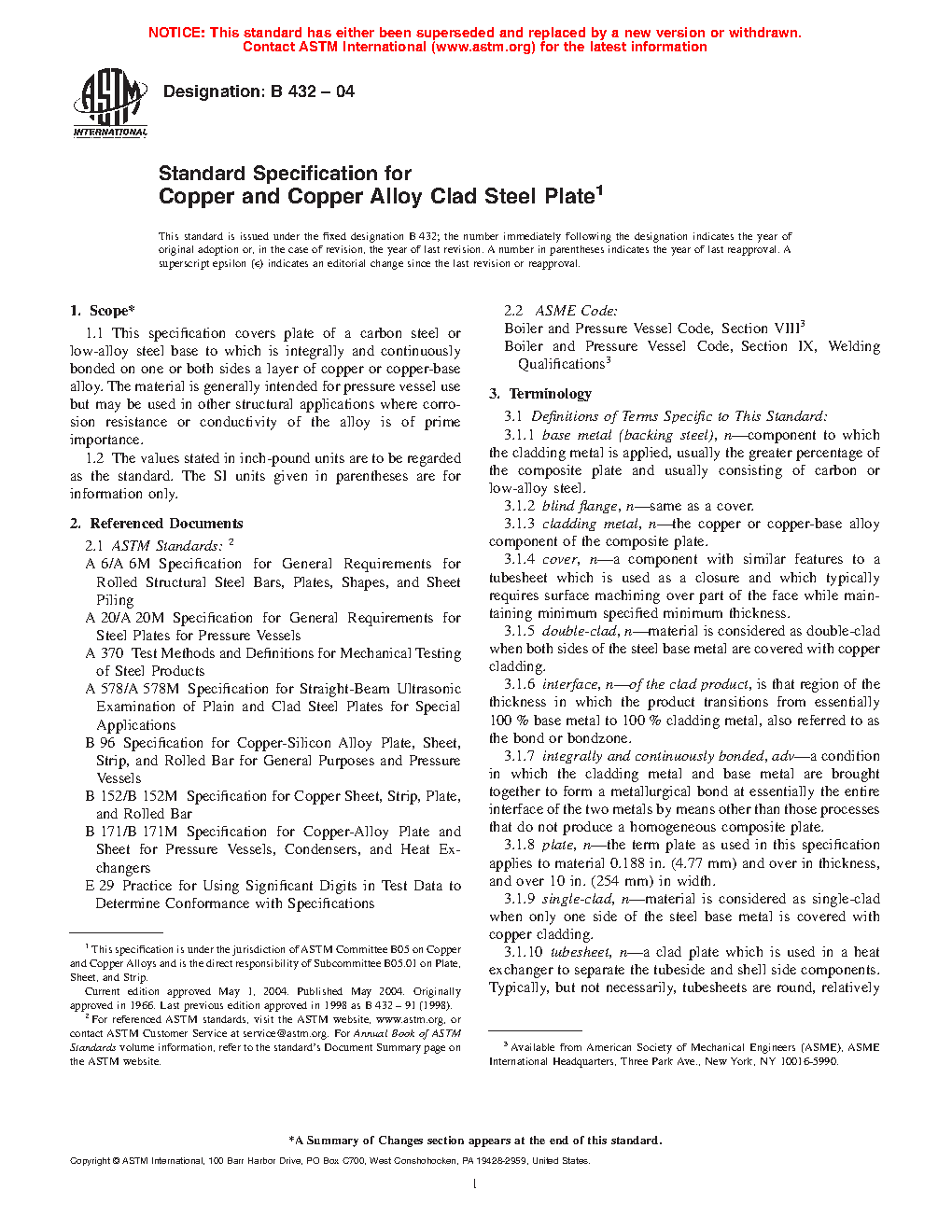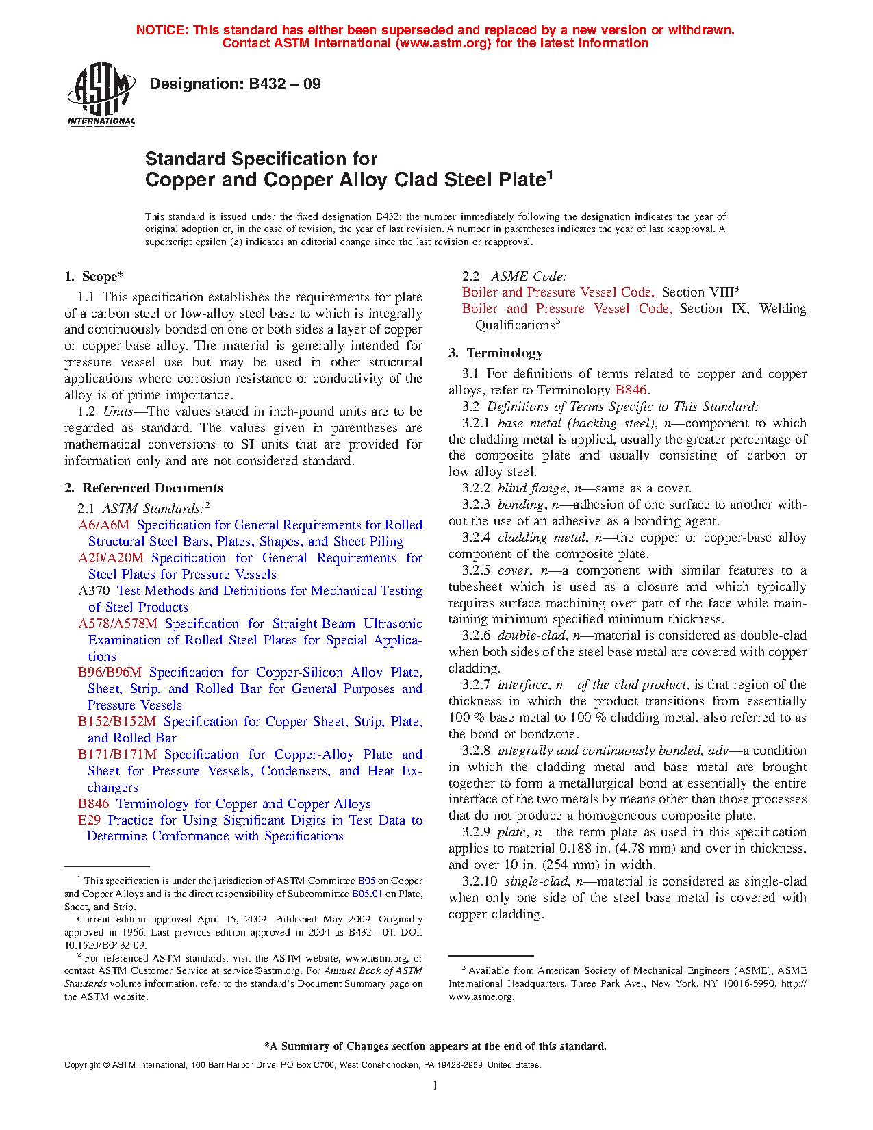 1.1 This specification covers base metal plate of carbon steel or low-alloy steel to which a thickness of copper or copper alloy is continuously and integrally bonded on one or both sides.