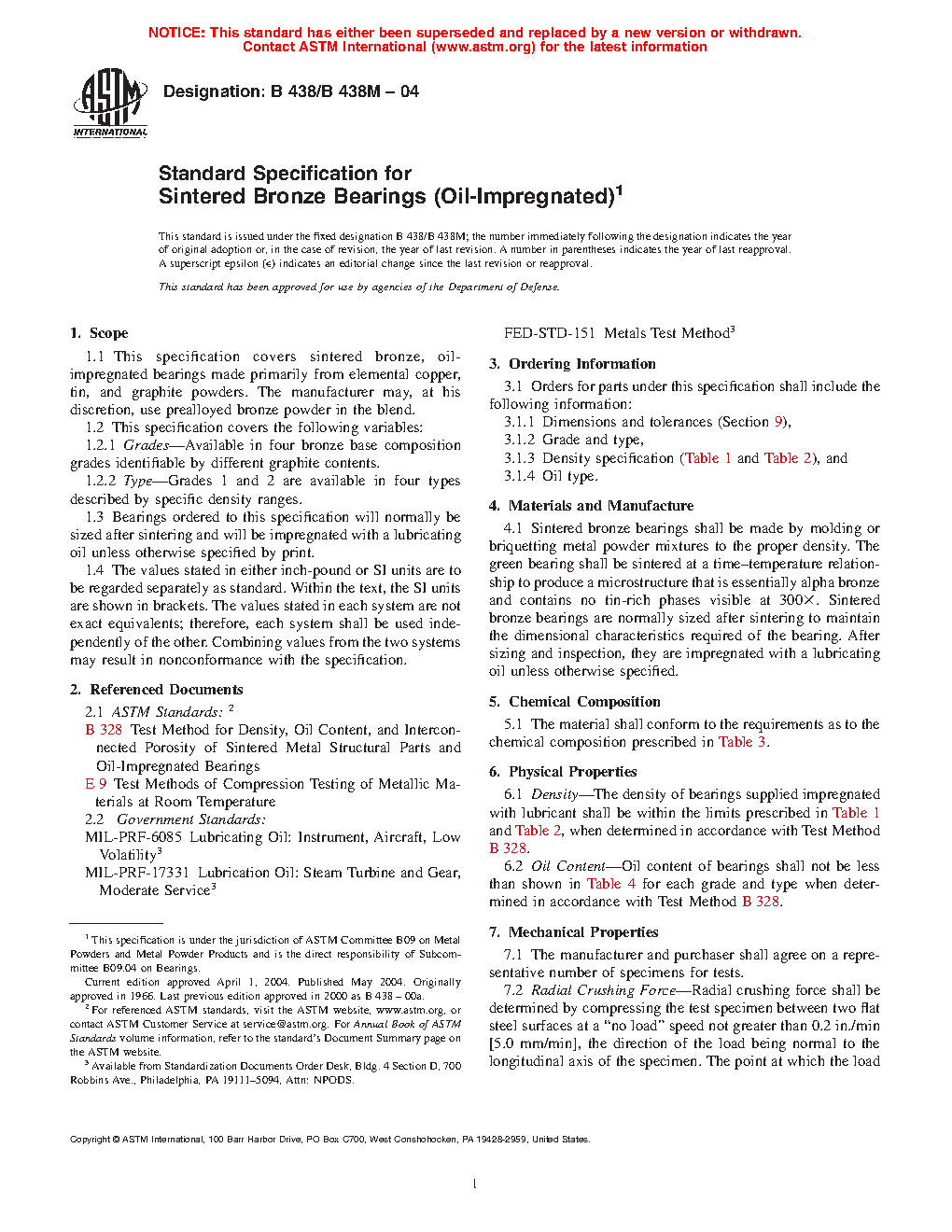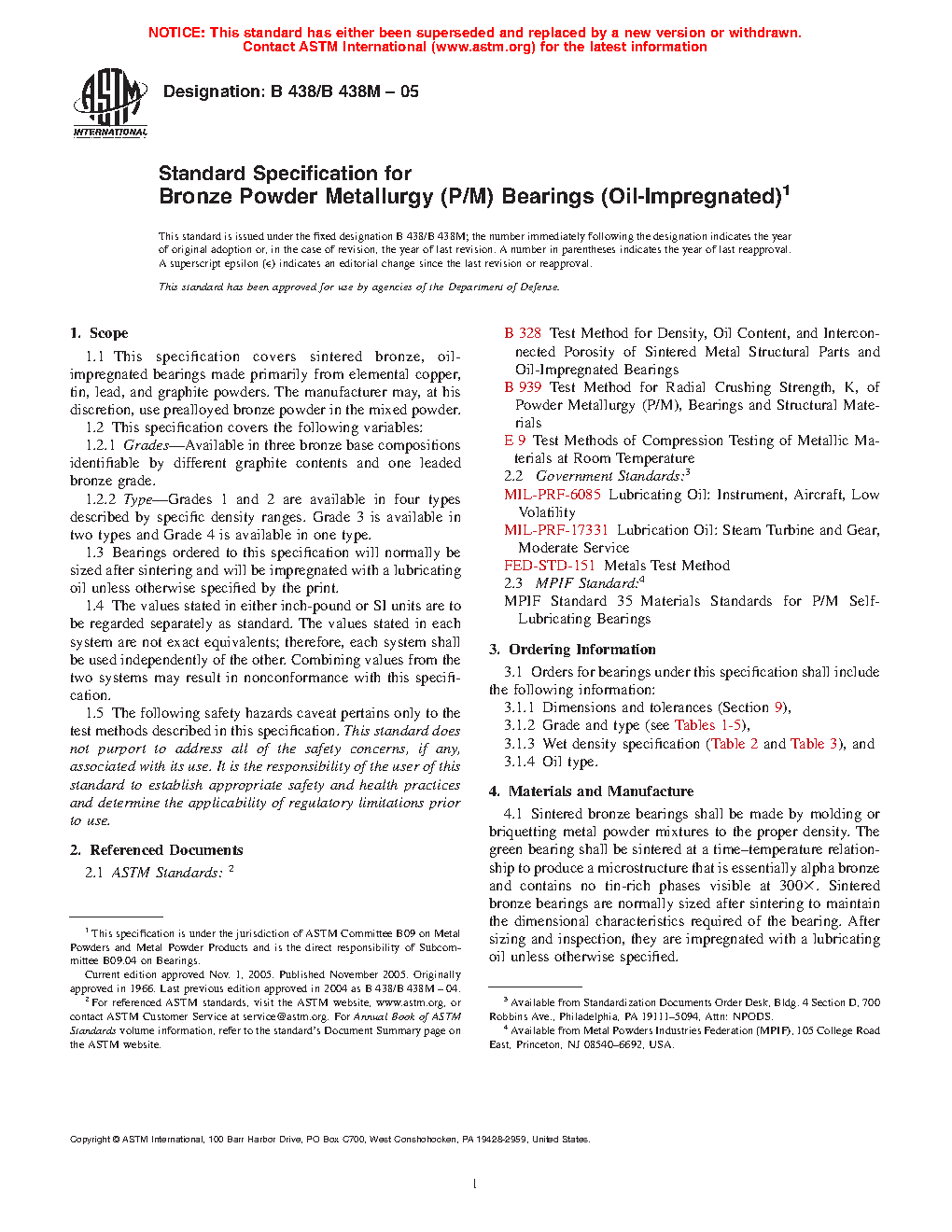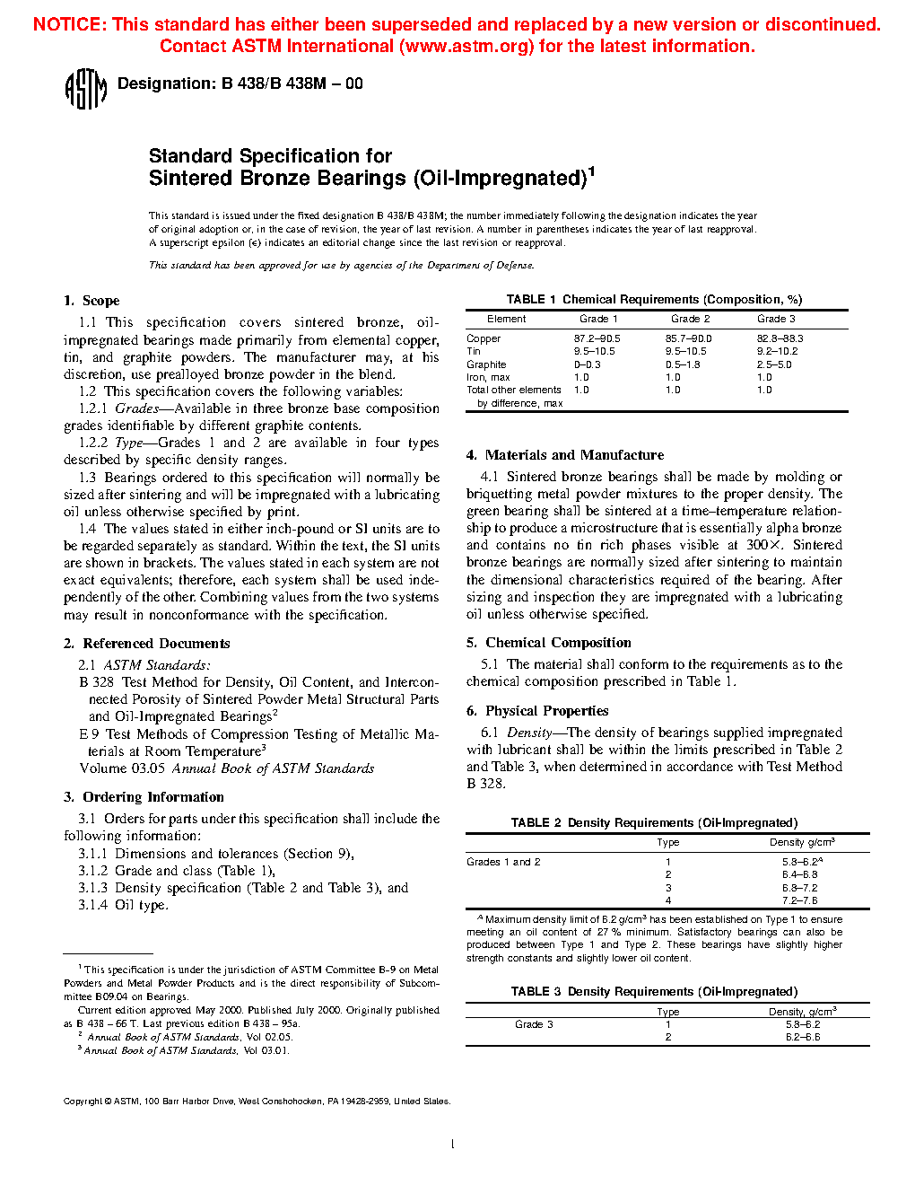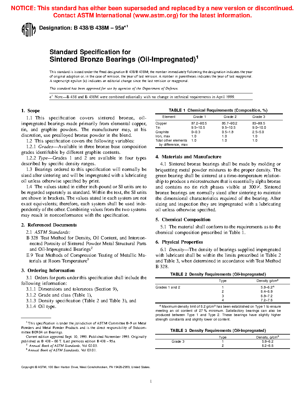 1.1 This specification covers sintered bronze, oil-impregnated bearings made primarily from elemental copper, tin, and graphite powders. The manufacturer may, at his discretion, use prealloyed bronze powder in the blend.