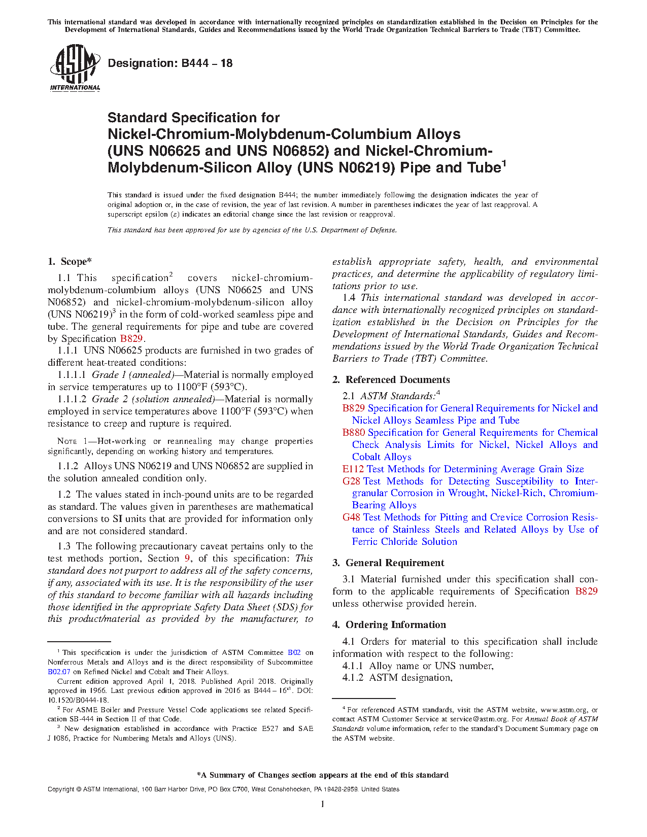 This specification covers UNS N06625 and UNS N06852 nickel-chromium-molybdenum-columbium alloys and UNS N06219 nickel-chromium-molybdenum-silicon alloy in the form of cold-worked seamless pipe and tube. UNS N06625 products are furnished in annealed Grade 1 and solution annealed Grade 2 while UNS N06219 and UNS N06852 are in solution annealed condition only. Chemical testing shall be performed on each type of material and shall conform to the chemical composition limits specified for carbon, manganese, silicon, phosphorus, sulfur, chromium, tantalum, columbium, cobalt, molybdenum, iron, aluminum, titanium, copper, and nickel. The material shall undergo tensile testing and shall conform to the required room temperature tensile properties like tensile strength, yield strength, and elongation depending on the heat treatment used and including small diameter and light-walled tubing. Each pipe or tube shall undergo hydrostatic testing and shall conform to the allowable fiber stress and also be examined with a nondestructive electric test as prescribed.