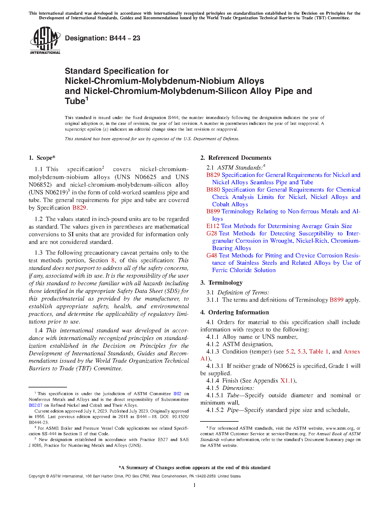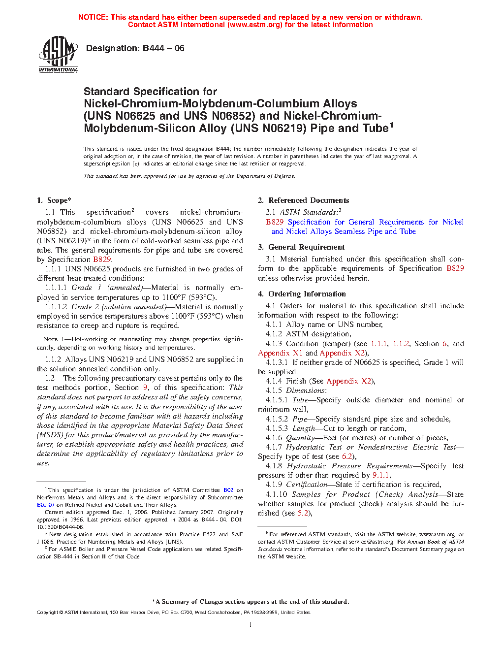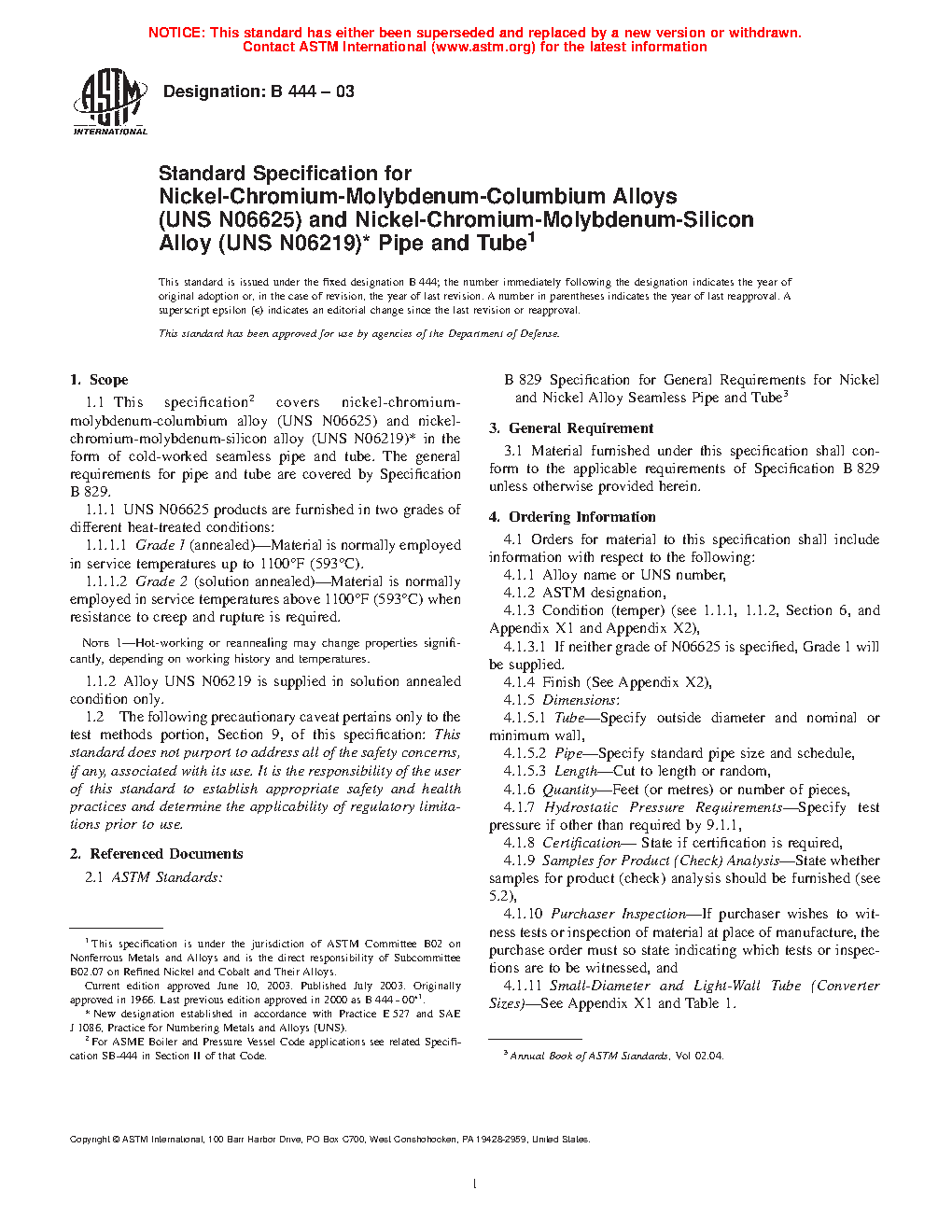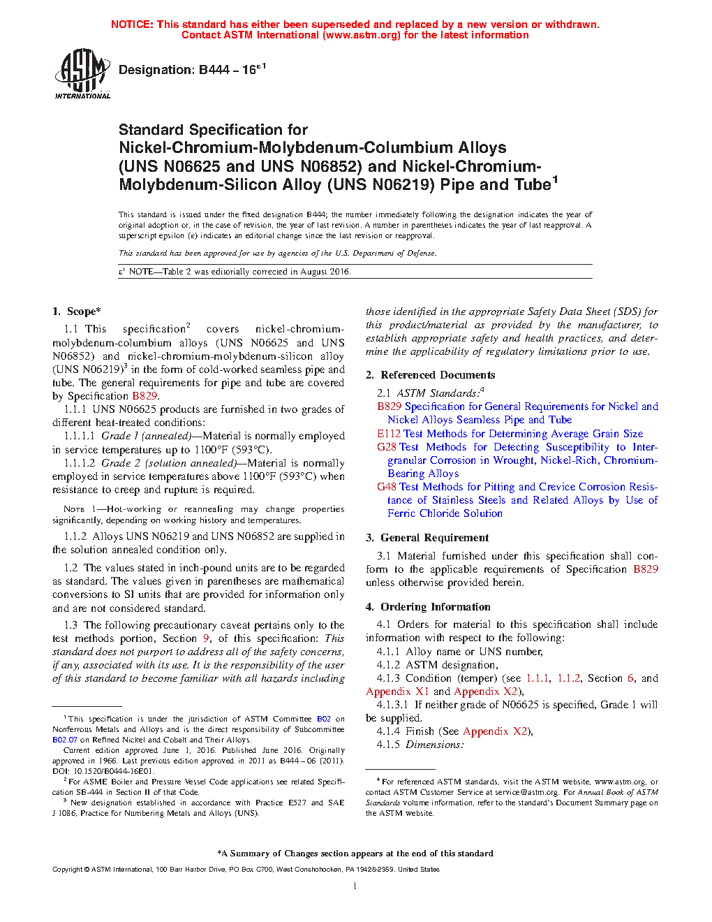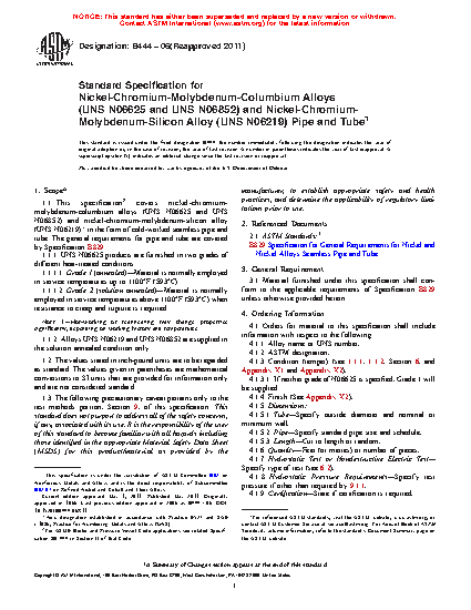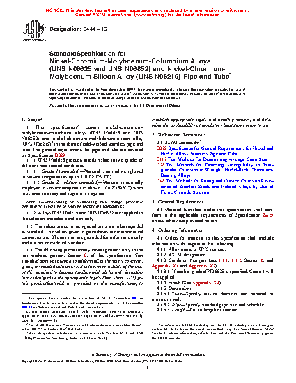 1.1 This specification2 covers nickel-chromium-molybdenum-niobium alloys (UNS N06625 and UNS N06852) and nickel-chromium-molybdenum-silicon alloy (UNS N06219)3 in the form of cold-worked seamless pipe and tube. The general requirements for pipe and tube are covered by Specification B829.