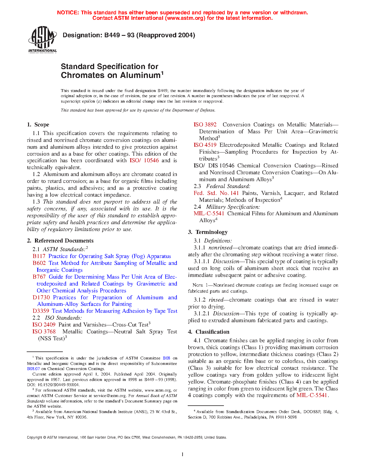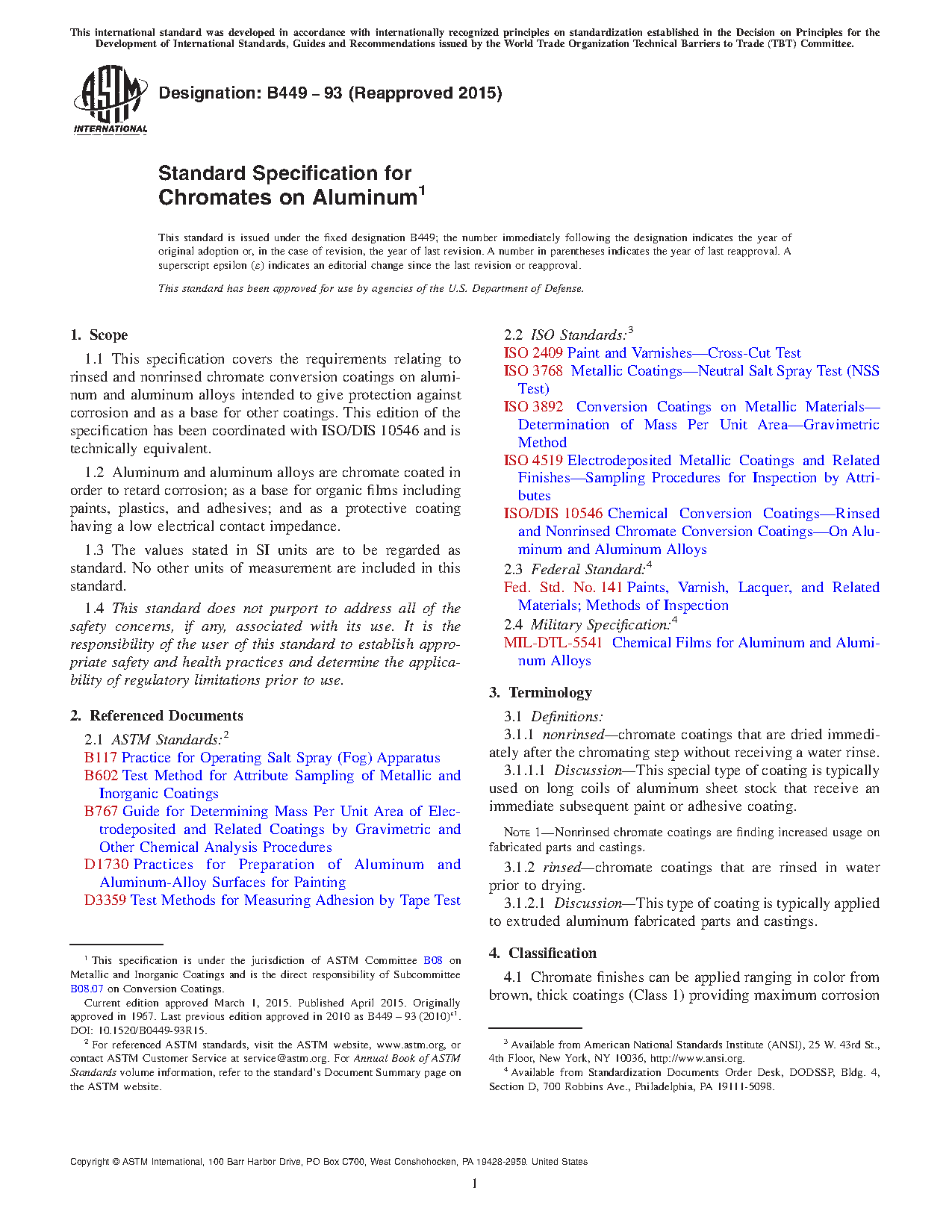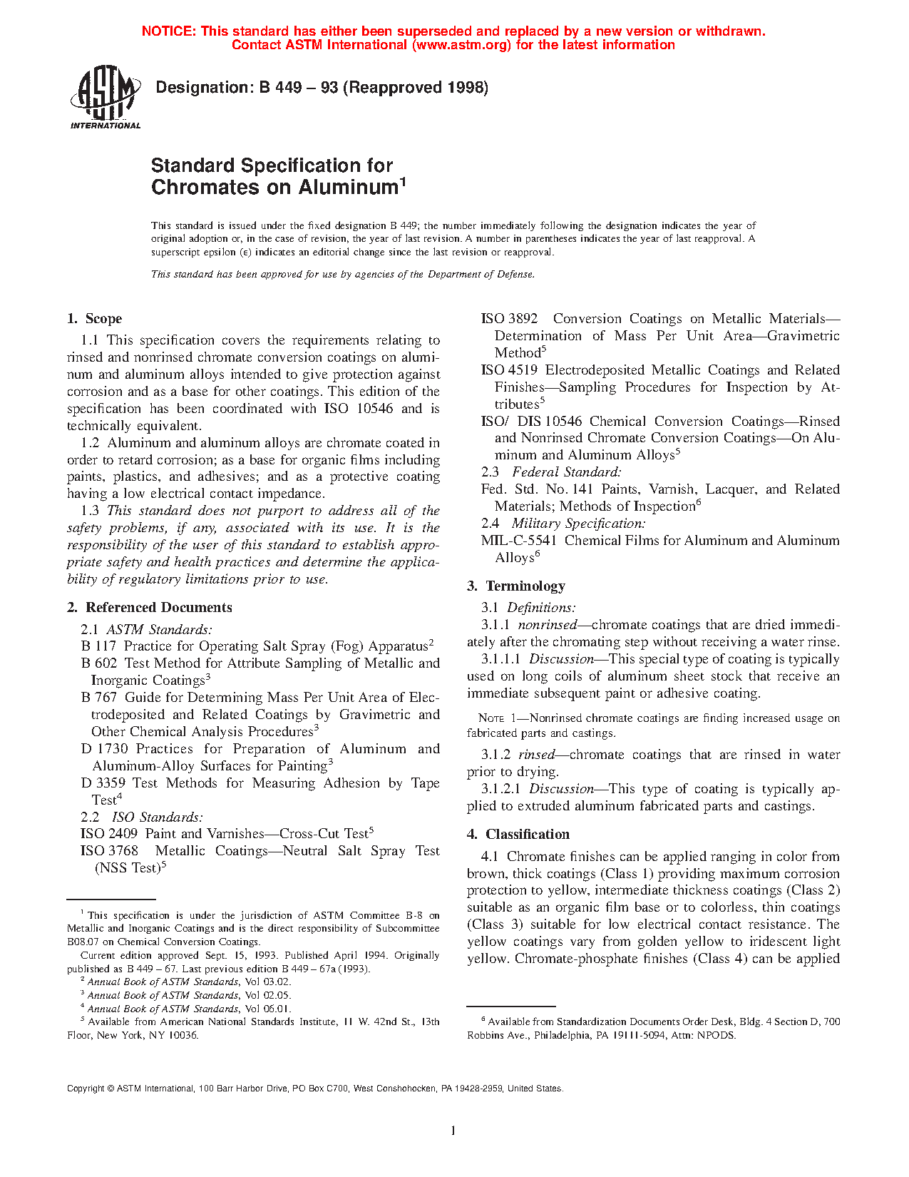 This specification covers the requirements relating to rinsed and non rinsed chromate conversion coatings on aluminum and aluminum alloys intended to give protection against corrosion and as a base for other coatings. Aluminum and aluminum alloys are chromate coated in order to retard corrosion; as a base for organic films including paints, plastics, and adhesives; and as a protective coating having a low electrical contact impedance. The materials are classified according to its coating thickness: Class 1; Class 2; Class 3; and Class 4. Chromate conversion coatings are normally applied by dipping: the coating may also be applied by inundation, spraying, roller coating, or by wipe-on techniques.