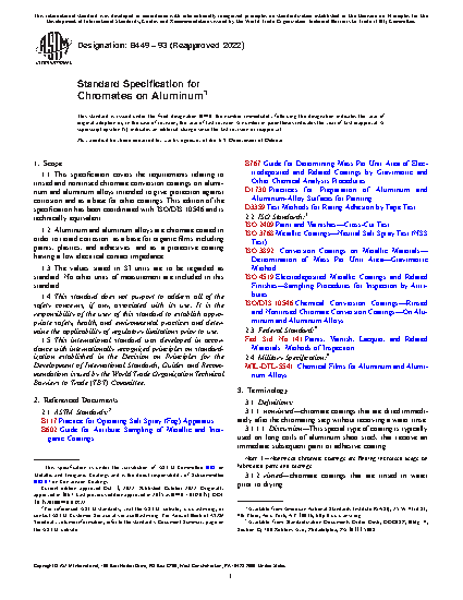 1.1 This specification covers the requirements relating to rinsed and nonrinsed chromate conversion coatings on aluminum and aluminum alloys intended to give protection against corrosion and as a base for other coatings. This edition of the specification has been coordinated with ISO/DIS 10546 and is technically equivalent.
