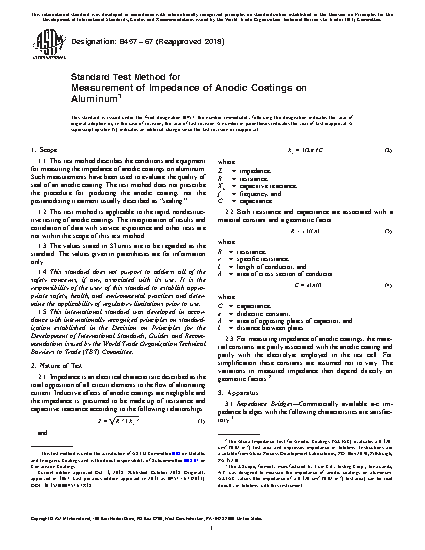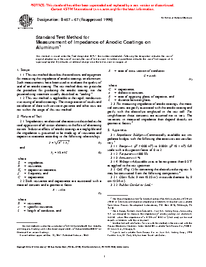 1.1 This test method describes the conditions and equipment for measuring the impedance of anodic coatings on aluminum. Such measurements have been used to evaluate the quality of seal of an anodic coating. The test method does not prescribe the procedure for producing the anodic coating, nor the postanodizing treatment usually described as “sealing.”