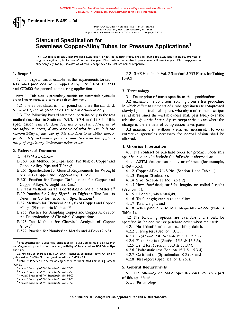 1.1 This specification establishes the requirements for seamless tubes produced from Copper Alloy UNS Nos. C19200 and C70600 for general engineering applications.