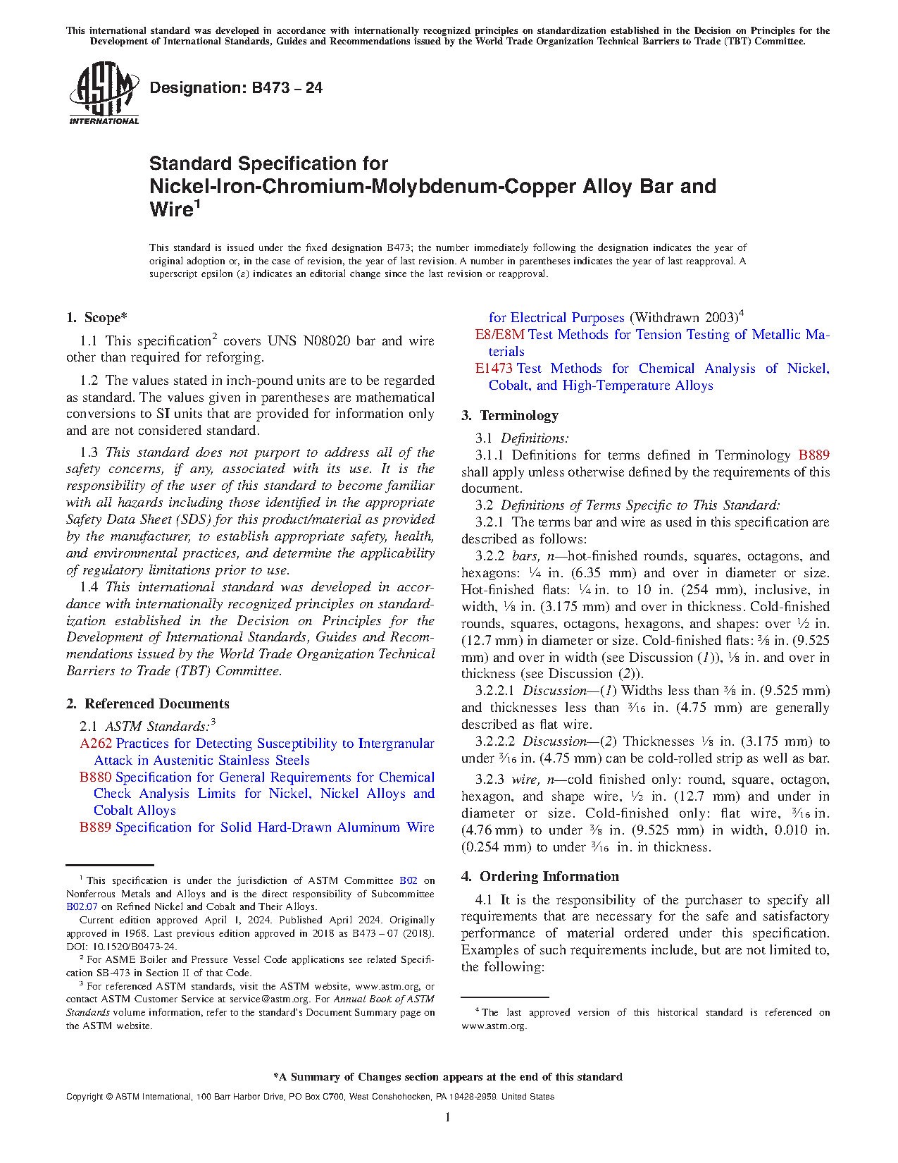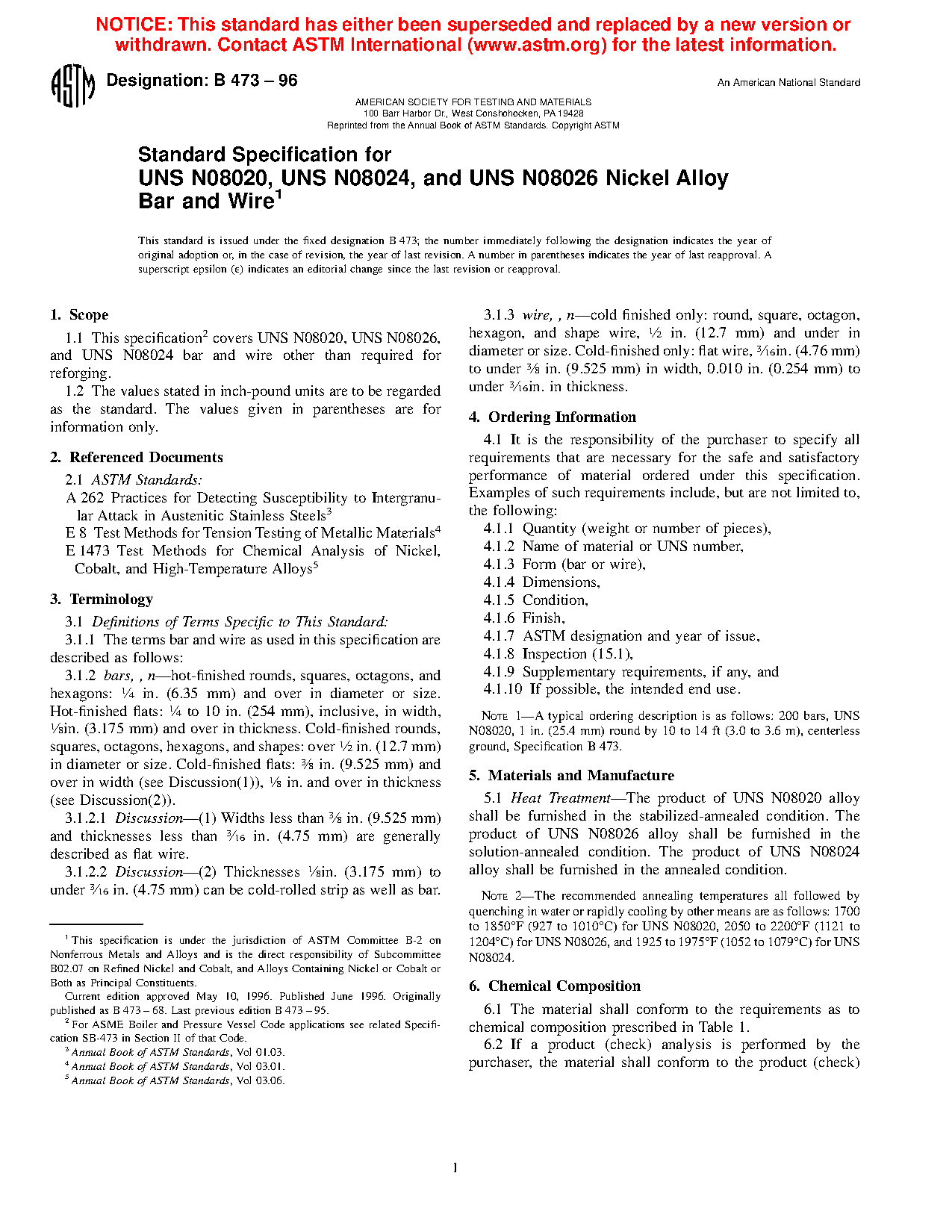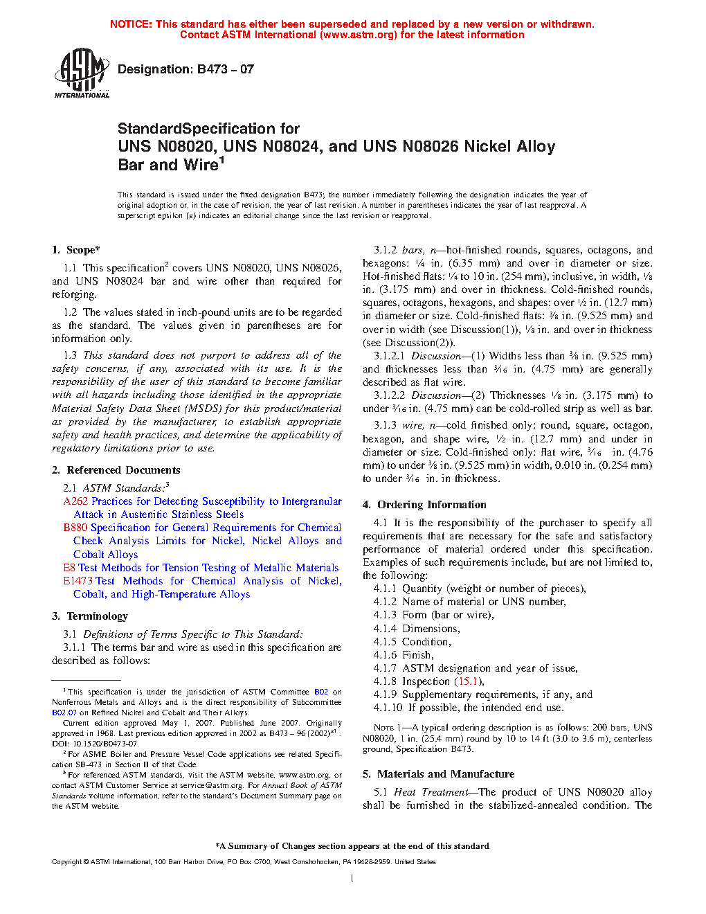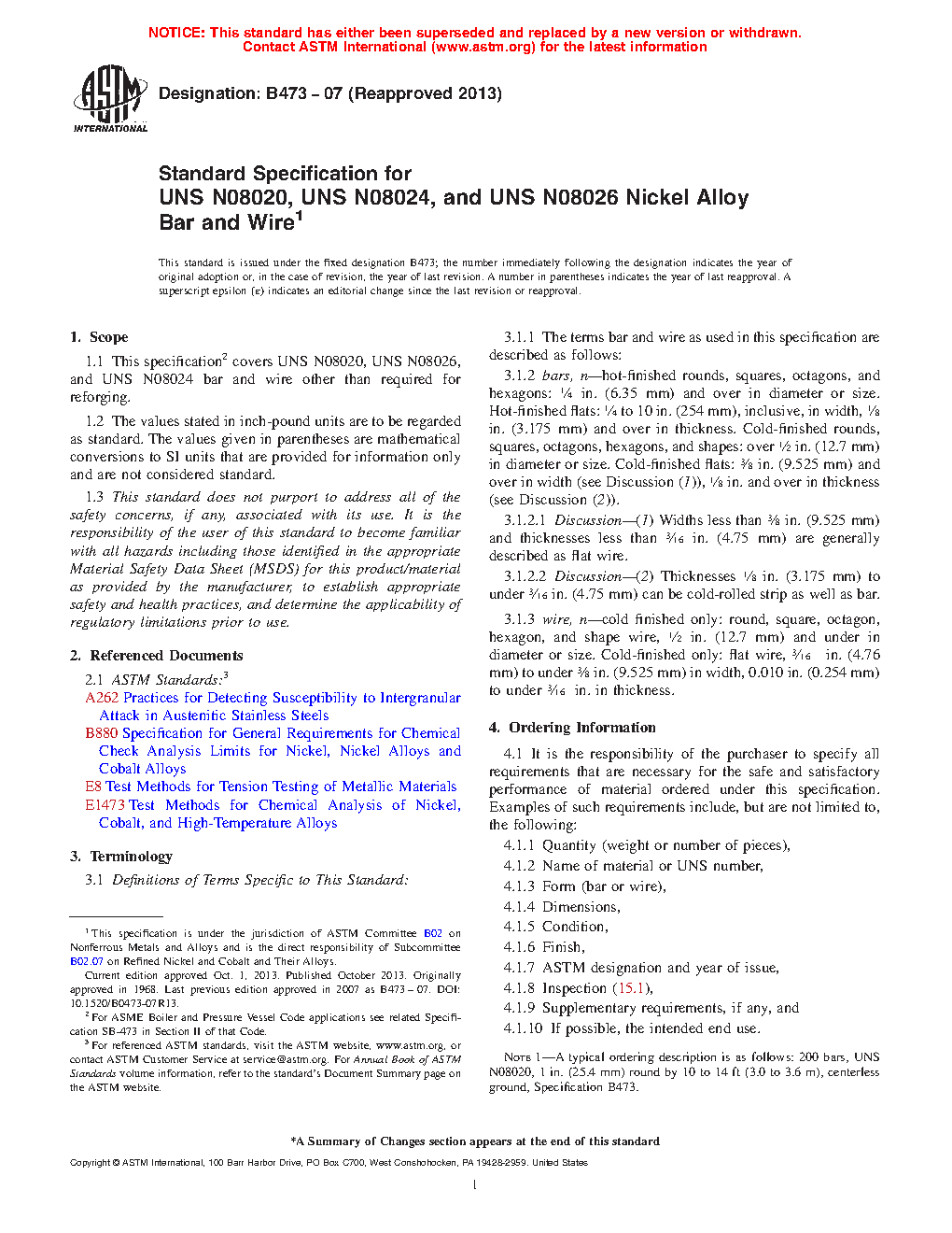Standard Specification for UNS N08020, UNS N08024, and UNS N08026 Nickel Alloy Bar and Wire
