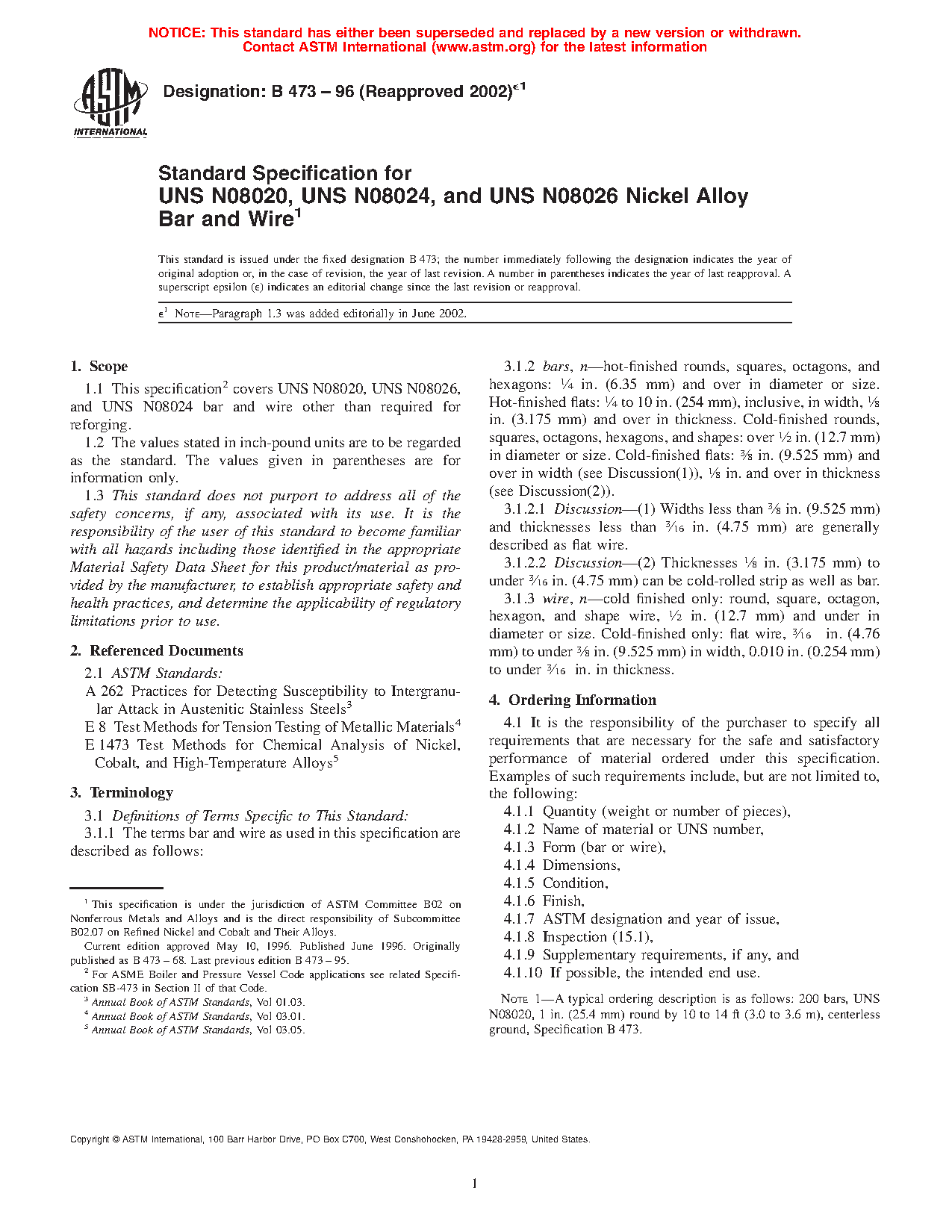 1.1 This specification covers UNS N08020, UNS N08026, and UNS N08024 bar and wire other than required for reforging.