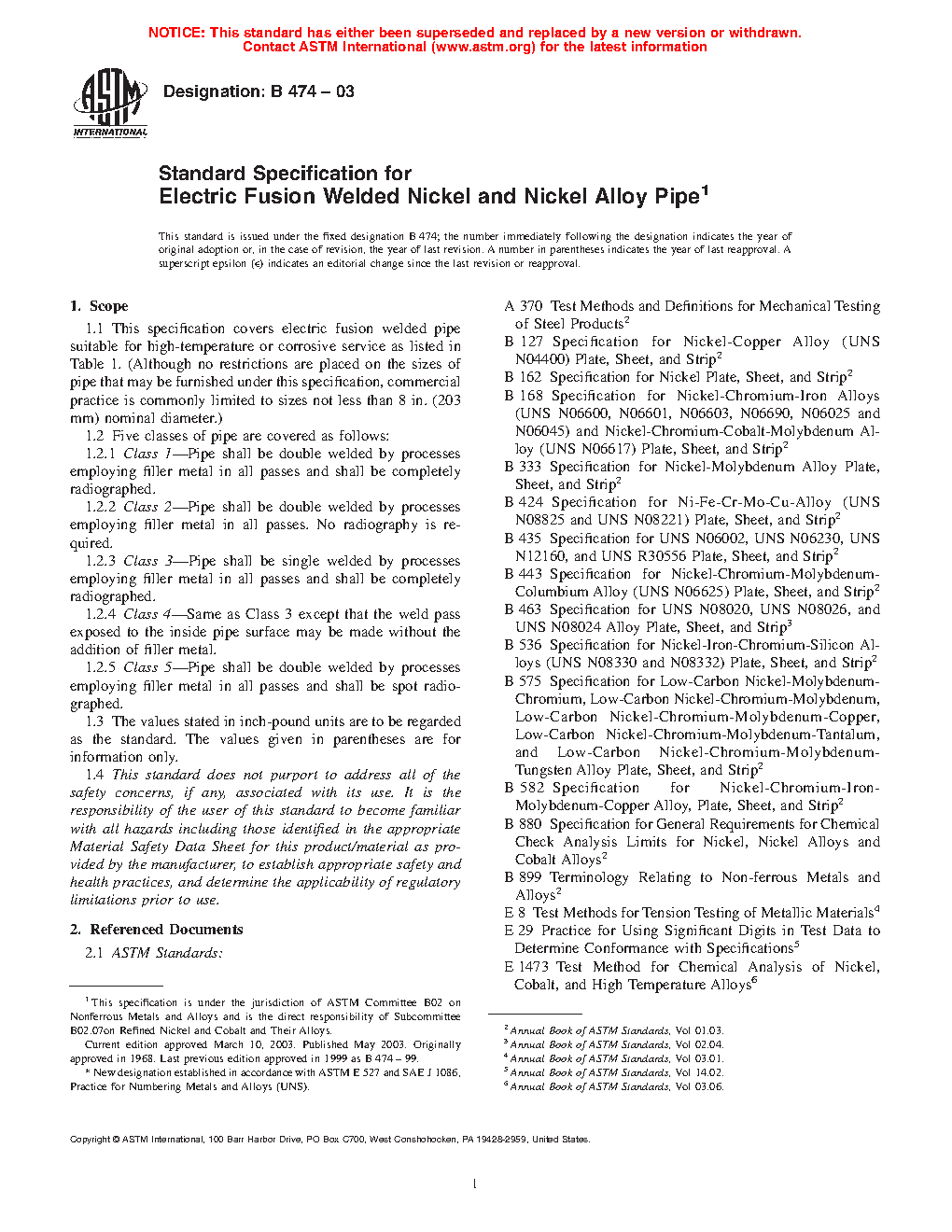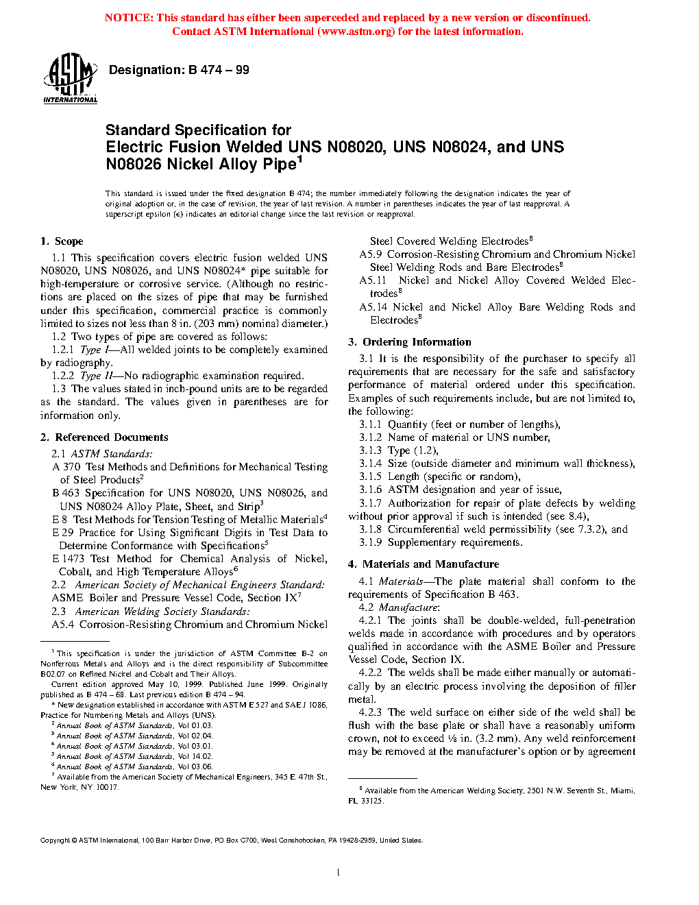 Standard Specification for Electric Fusion Welded UNS N08020, UNS N08026, and UNS N08024 Nickel Alloy Pipe