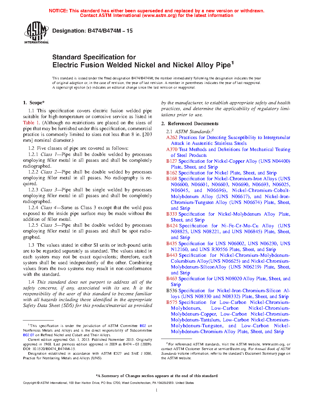 This specification covers electric fusion welded pipe suitable for high-temperature or corrosive service. The pipes are designated into five classes namely Class 1, Class 2, Class 3, Class 4 and Class 5, according to how they are to be welded. The joints shall be full penetration double-welded or single-welded butt joints employing fusion welding processes. The furnished pipe shall undergo heat treatment and a chemical analysis shall be employed for both plate and weld. Each pipe shall be subjected to transverse tension test, transverse guided weld bend test and hydrostatic pressure test.