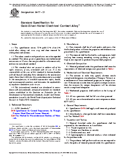 This specification covers gold-silver-nickel alloy tubing, rod, wire, strip, and sheet material for sliding electrical contacts. Raw materials shall be of such quality and purity that the finished product will have the properties and characteristics prescribed in this specification. The material shall be finished by cold working, heat treating, annealing, turning, grinding, or pickling as are required to produce the prescribed properties. Material produced shall meet the chemical composition requirements. Mechanical properties such as tensile strength, elongation, Knoop hardness, microhardness, as well as the electrical contact shall conform to the prescribed specification.