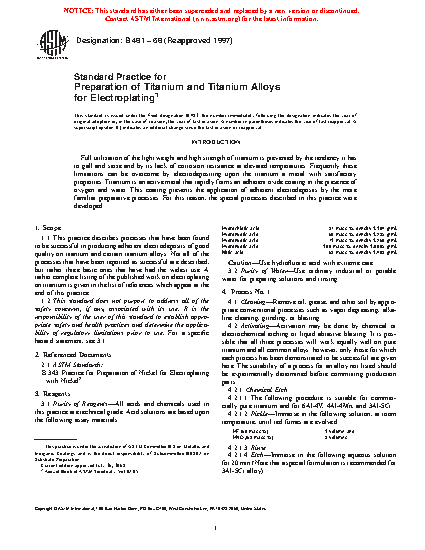 1.1 This practice describes processes that have been found to be successful in producing adherent electrodeposits of good quality on titanium and certain titanium alloys. Not all of the processes that have been reported as successful are described, but rather three basic ones that have had the widest use. A rather complete listing of the published work on electroplating on titanium is given in the list of references which appear at the end of this practice.