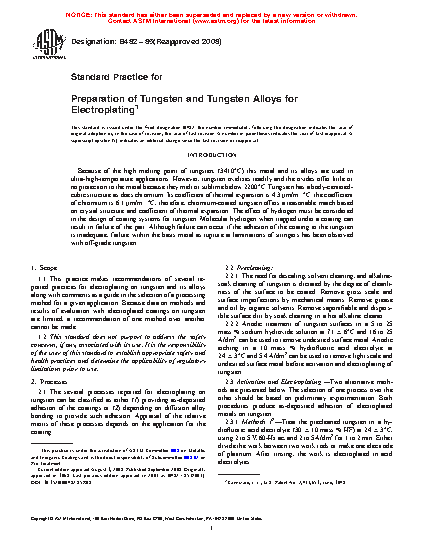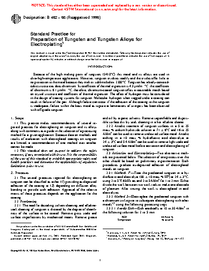 1.1 This practice makes recommendations of several reported practices for electroplating on tungsten and its alloys along with comments as a guide in the selection of a processing method for a given application. Because data on methods and results of evaluation with electroplated coatings on tungsten are limited, a recommendation of one method over another cannot be made.