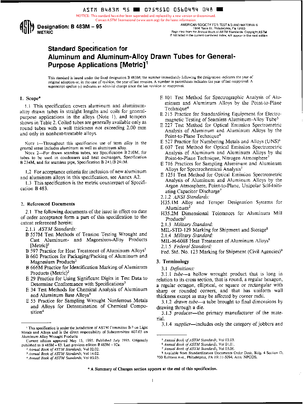 Specification for Aluminum and Aluminum-Alloy Drawn Tubes for General-Purpose Applications (Metric) (Withdrawn 1998)