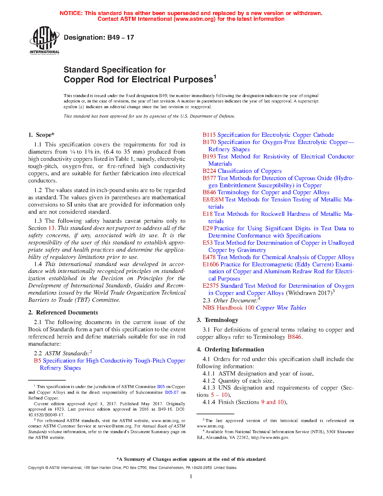 1.1 This specification covers the requirements for rod in diameters from 1/4 in. to 13/8 in. (6.4 mm to 35 mm) produced from high conductivity coppers listed in Table 1, namely, electrolytic tough-pitch, oxygen-free, or fire-refined high conductivity coppers, and are suitable for further fabrication into electrical conductors.