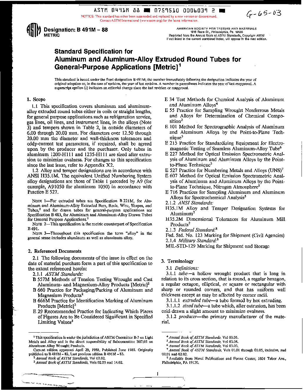 Specification for Aluminum and Aluminum-Alloy Extruded Round Tubes for General Purpose Applications (Metric) (Withdrawn 1990)