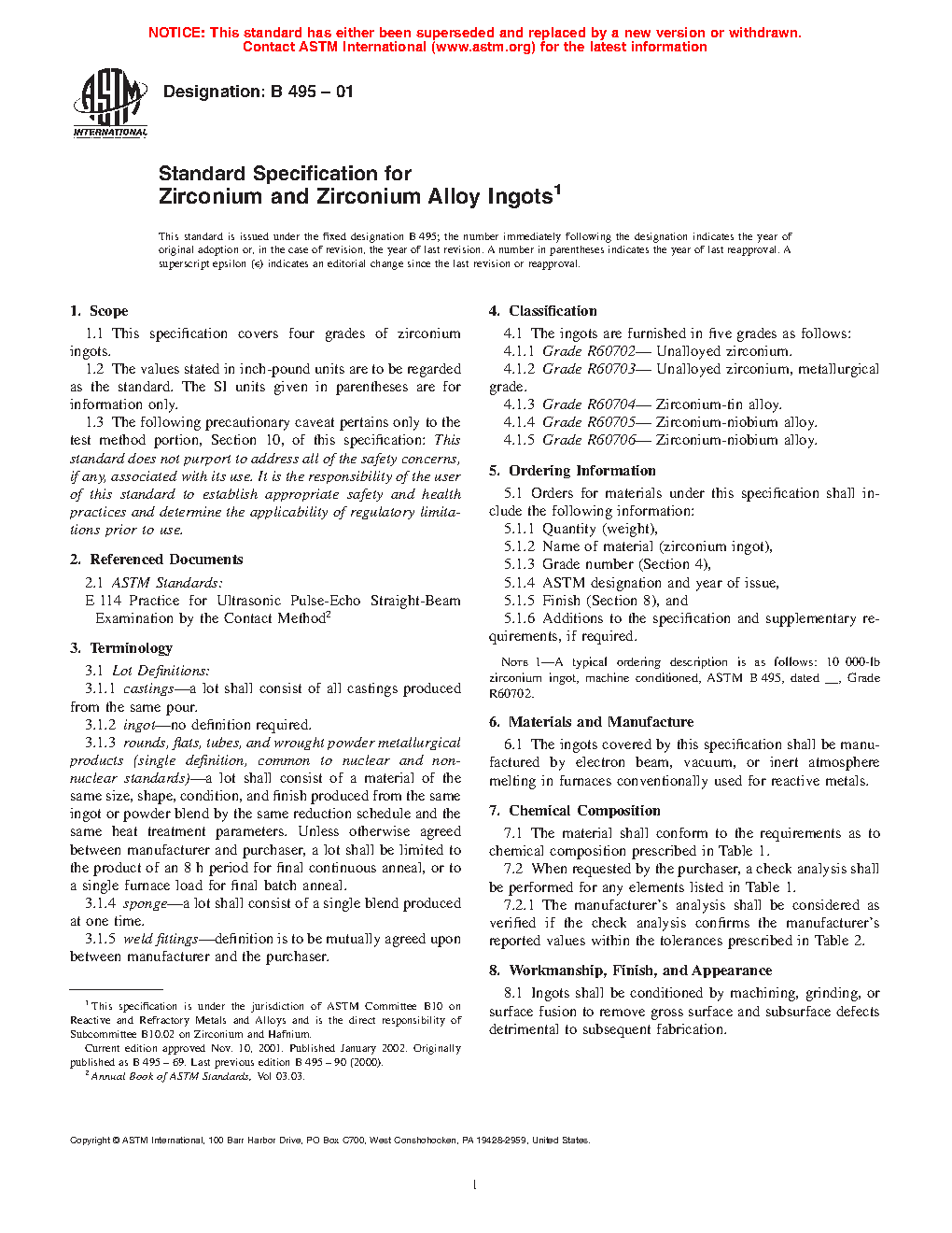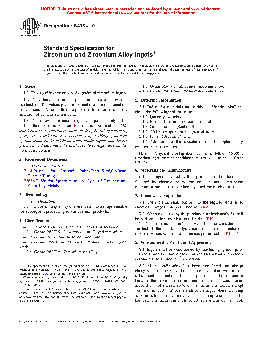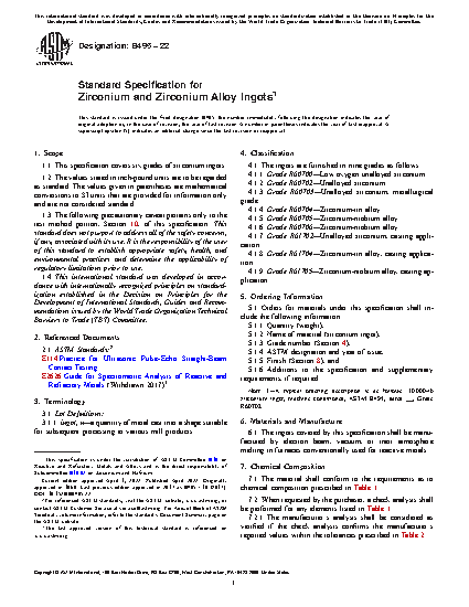 This specification covers the six grades of zirconium and zirconium alloy ingots: Grade R60700, Grade R60702, Grade R60703, Grade R60704, Grade R60705, and Grade R60706. These materials shall be manufactured by electron beam, vacuum, or inert atmosphere melting in furnaces. The material shall form to the required chemical composition of zirconium, hafnium, iron, chromium, tin, hydrogen, nitrogen, carbon, niobium, and oxygen. Check analysis shall be performed. The following test methods shall be done: ultrasonic test and chemical test.
