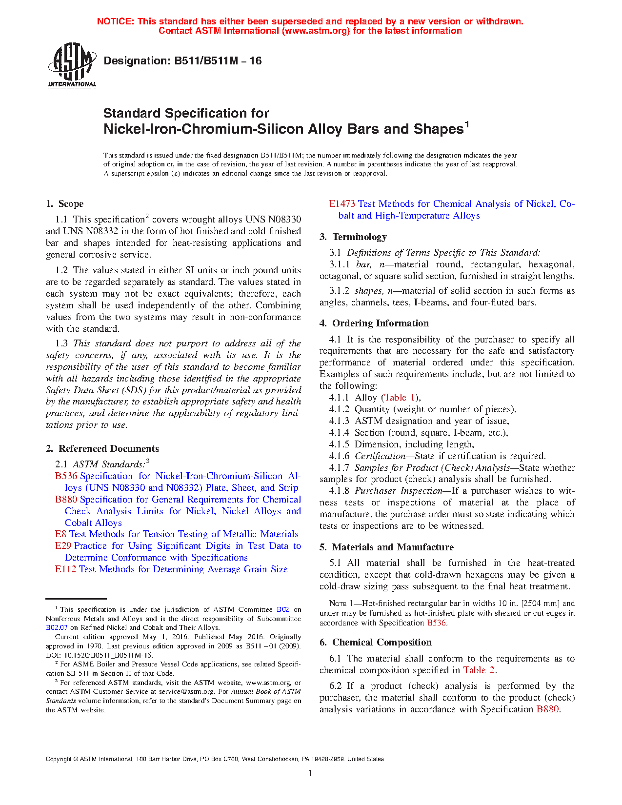 1.1 This specification2 covers wrought alloys UNS N08330 and UNS N08332 in the form of hot-finished and cold-finished bar and shapes intended for heat-resisting applications and general corrosive service.