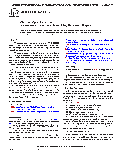 This specification covers hot- and cold-finished bars and shapes of wrought nickel-iron-chromium-silicon alloys with UNS Nos. N08330 and N08332 intended for heat-resisting applications and general corrosive service. Materials shall be furnished in the heat-treated condition, except that cold-drawn hexagons may be given a cold-drawn sizing pass subsequent to the final heat treatment. Specimens shall be sampled and prepared, then tested accordingly to examine their conformance to dimensional (thickness, width, length, and angularity), mechanical (tensile and yield strengths, and elongation), chemical composition, and grain size requirements.