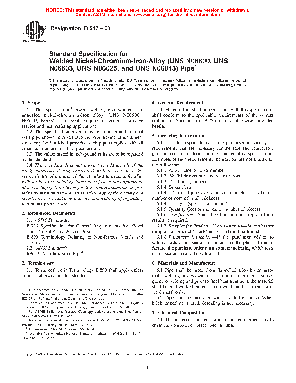 1.1 This specification2 covers welded, cold-worked, and annealed nickel-chromium-iron alloy (UNS N06600,3 N06603, N06025, and N06045) pipe for general corrosive service and heat-resisting applications.