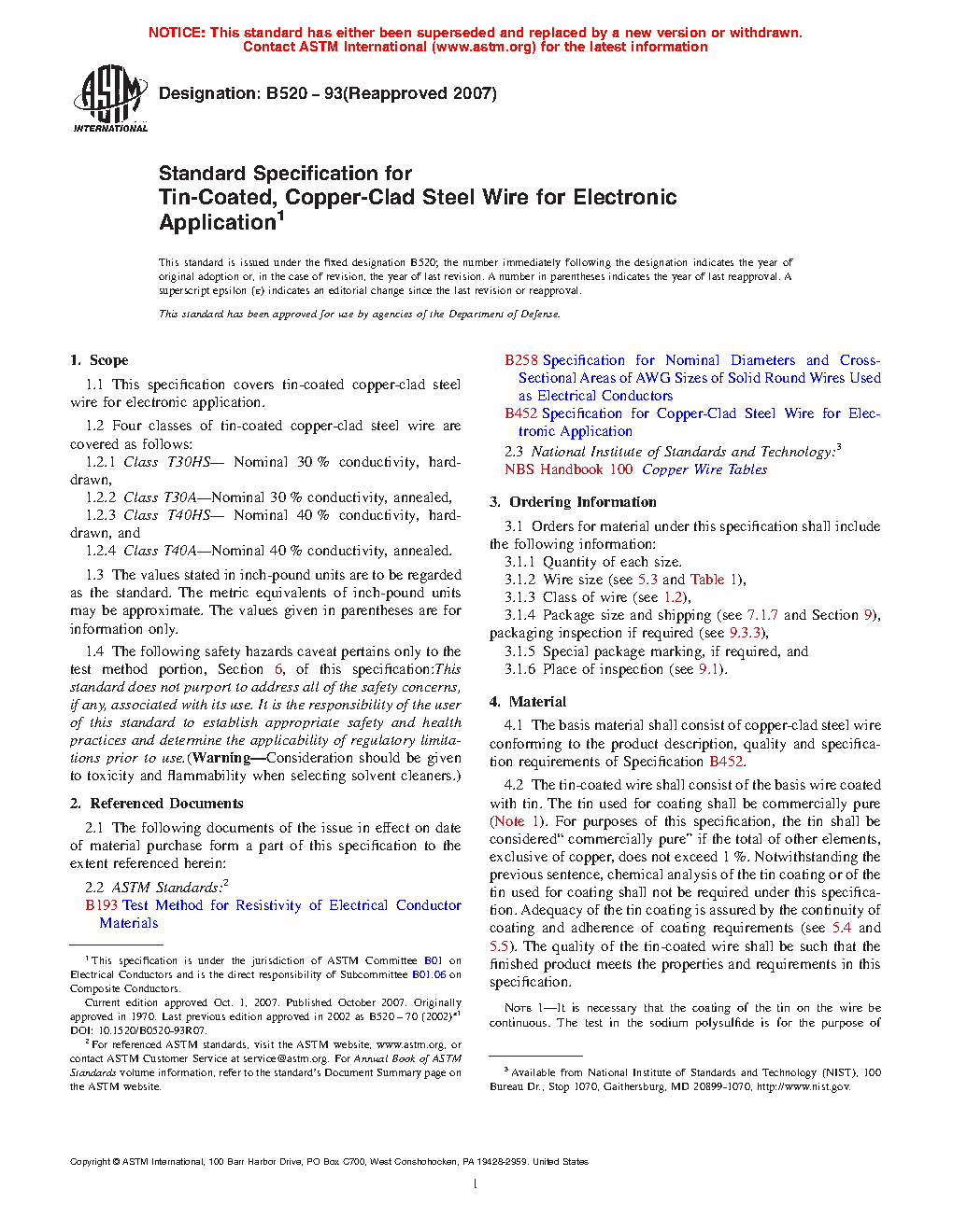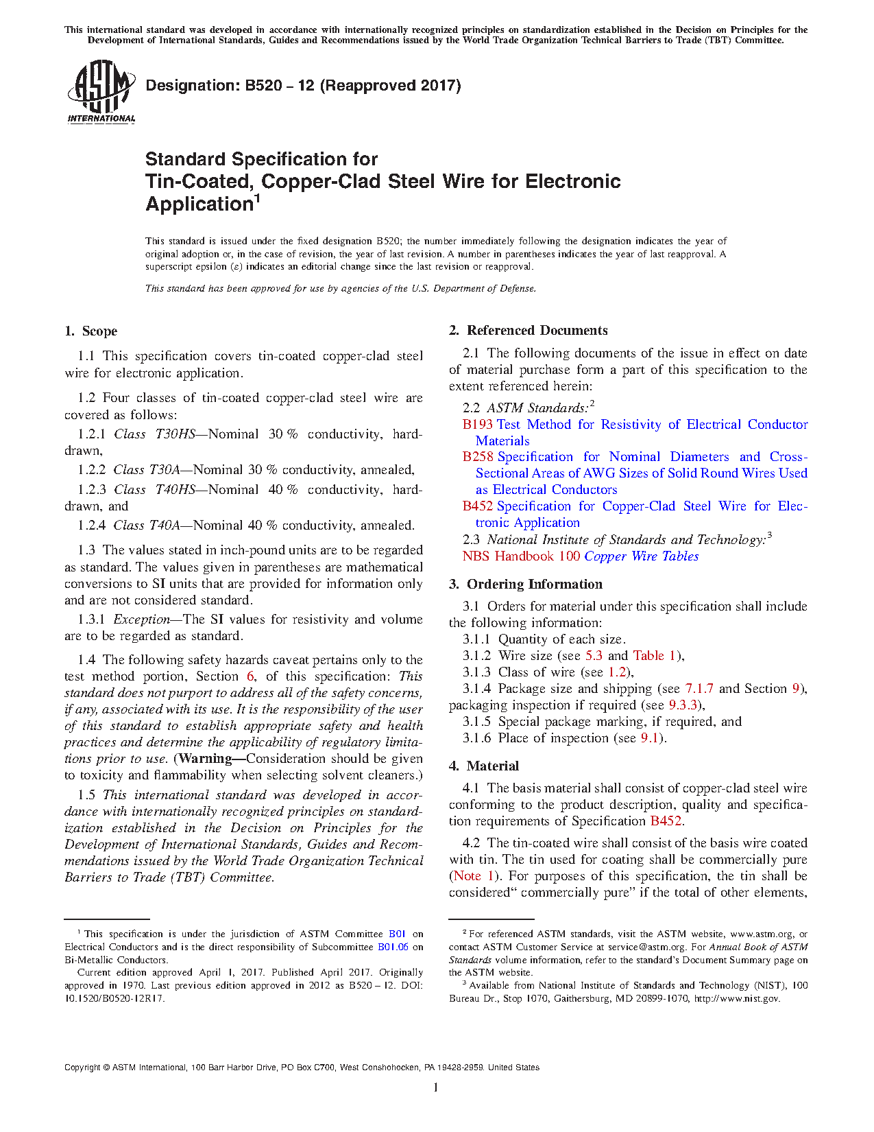 This specification covers tin-coated, copper-clad steel wires for electronic applications. The four classes of steel wires considered here are: hard-drawn wires with 30% nominal conductivity (Class T30HS); annealed wires with 30% nominal conductivity (Class T30A); hard-drawn wires with 40% nominal conductivity (Class T40HS); and annealed wires with 40% nominal conductivity (Class T40A). Specimens shall go through tests and shall adhere to specified requirements for dimensions, electrical resistivity, tensile strength, and coating continuity and adherence.