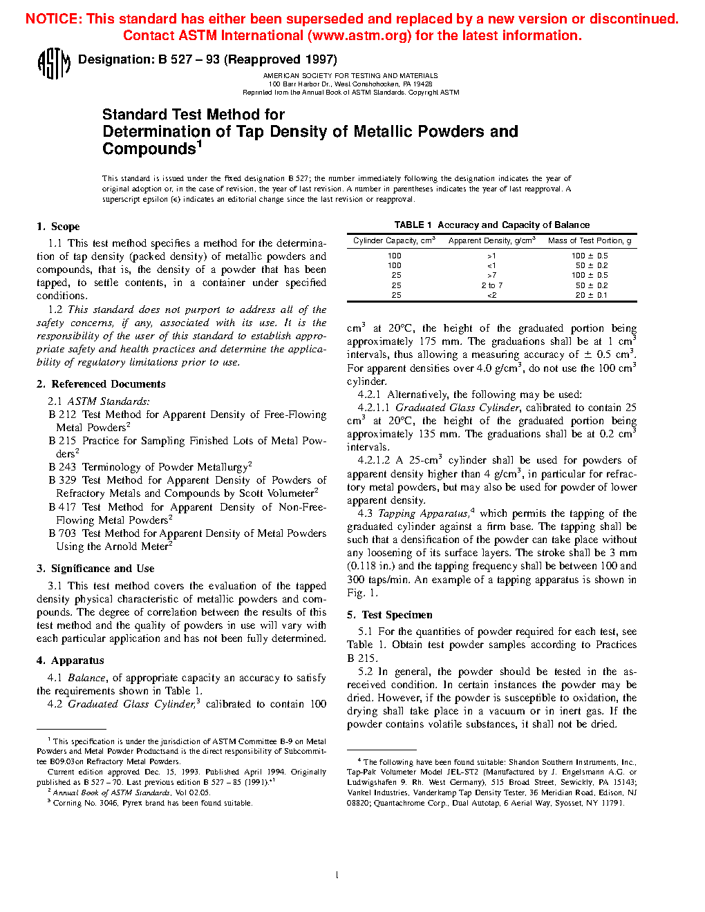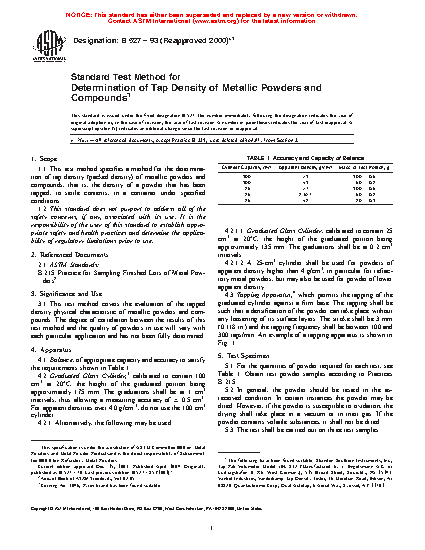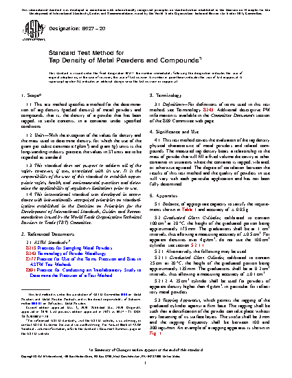 1.1 This test method specifies a method for the determination of tap density (packed density) of metal powders and compounds, that is, the density of a powder that has been tapped, to settle contents, in a container under specified conditions.