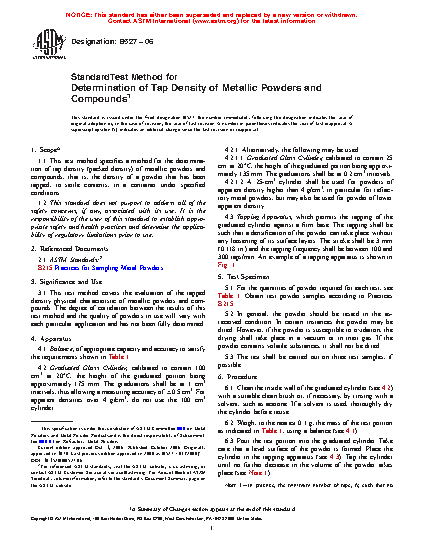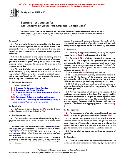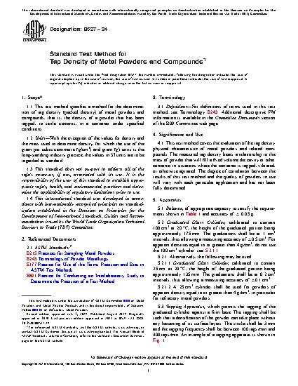 1.1 This test method specifies a method for the determination of tap density (packed density) of metal powders and compounds, that is, the density of a powder that has been tapped, to settle contents, in a container under specified conditions.