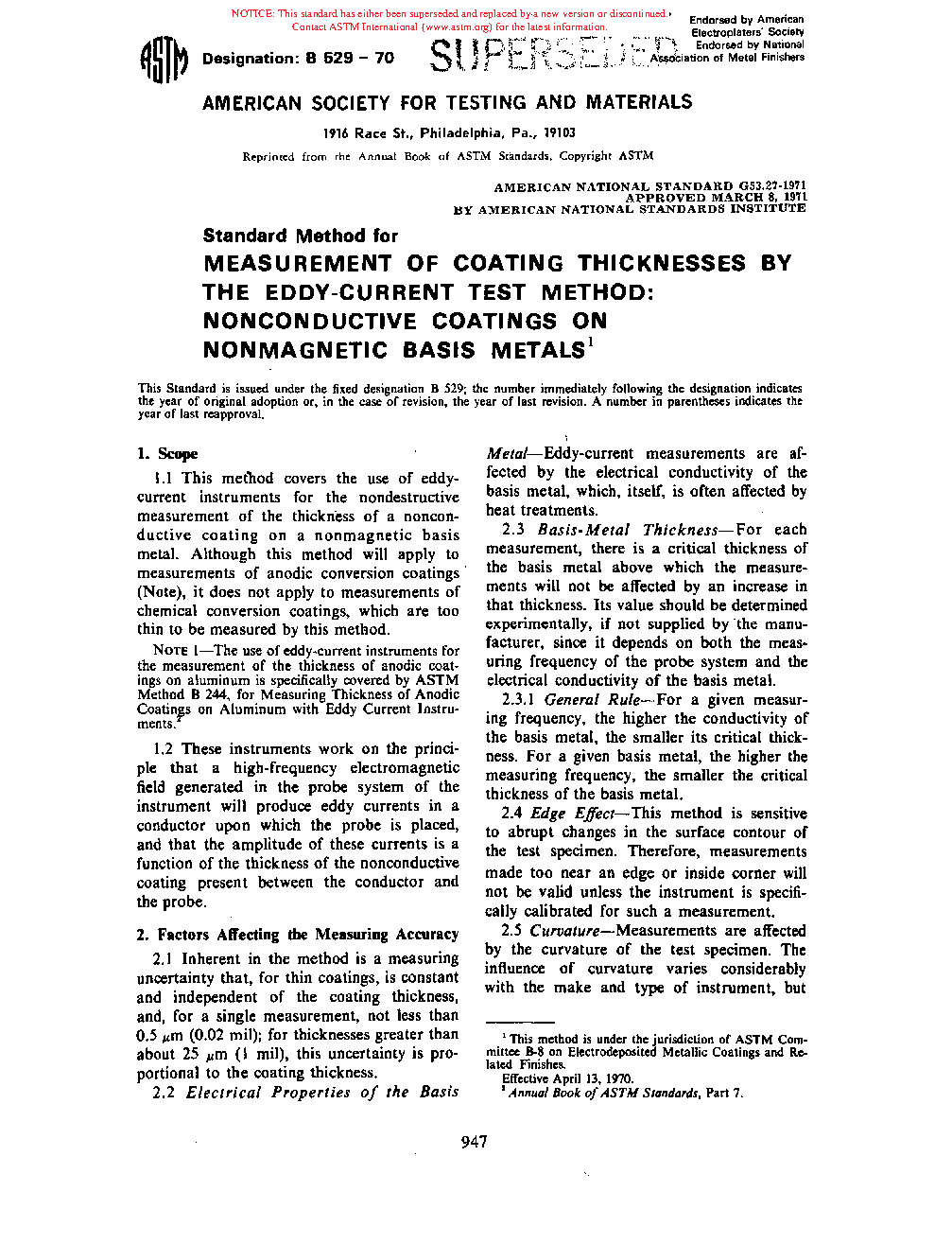 Test Method for Measurement of Coating Thickness by the Eddy Current Test Method: Non-Conductive Coating on Non-Magnetic Basis Metals (Withdrawn 1978)