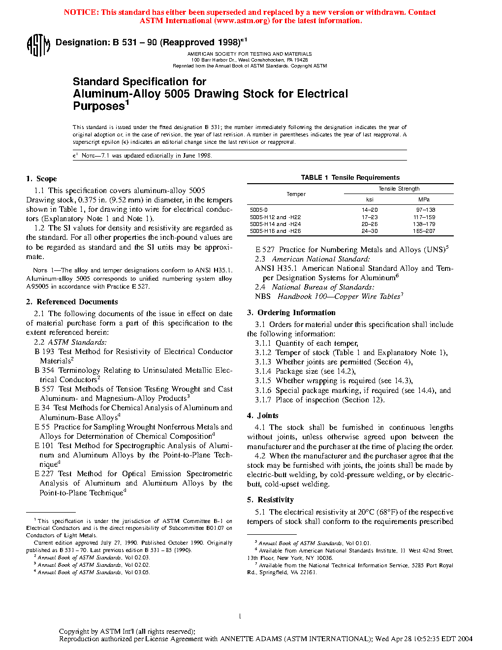 1.1 This specification covers aluminum-alloy 5005 Drawing stock, 0.375 in. (9.52 mm) in diameter, in the tempers shown in Table 1, for drawing into wire for electrical conductors (Explanatory Notes 1 and 2).