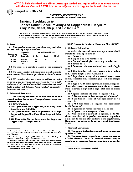 This specification establishes the requirements for plates, sheets, strips, and rolled bars of copper-cobalt-beryllium and copper-nickel-beryllium alloys with Copper Alloy UNS Nos. C17500 and C17510. The material for manufacture shall be cast and worked to such purity and soundness as to be suitable for processing by hot working, cold working, and thermal treatment to produce a uniform wrought structure and the specified temper. Products shall be produced in tempers TB00 (solution heat treated), or TD02 and TD04 (cold worked), TF00 or TH02 and TH04 (precipitation heat treated), or TM02 and TM04 (mill hardened). Products shall be sampled and prepared, then tested accordingly to examine their conformance to dimensional (thickness, width, length, straightness, and edges), mechanical (tensile strength, Rockwell hardness, and elongation), electrical conductivity, and chemical composition requirements.