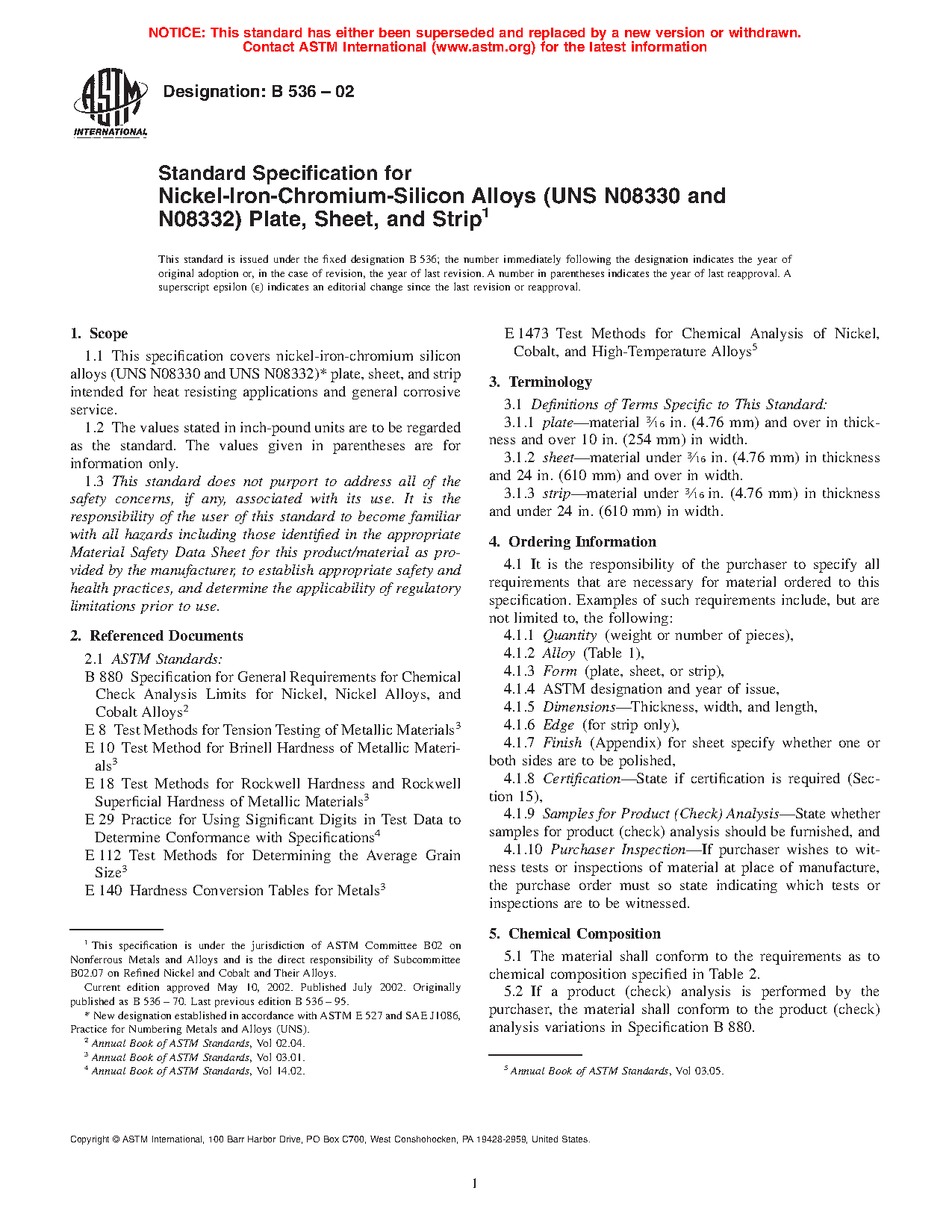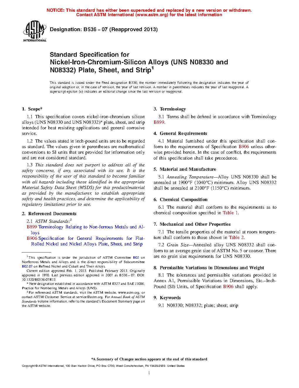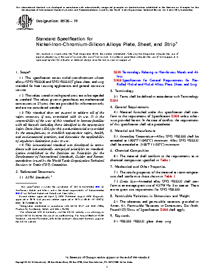 1.1 This specification covers nickel-iron-chromium silicon alloys (UNS N08330 and UNS N08332)2 plate, sheet, and strip intended for heat resisting applications and general corrosive service.