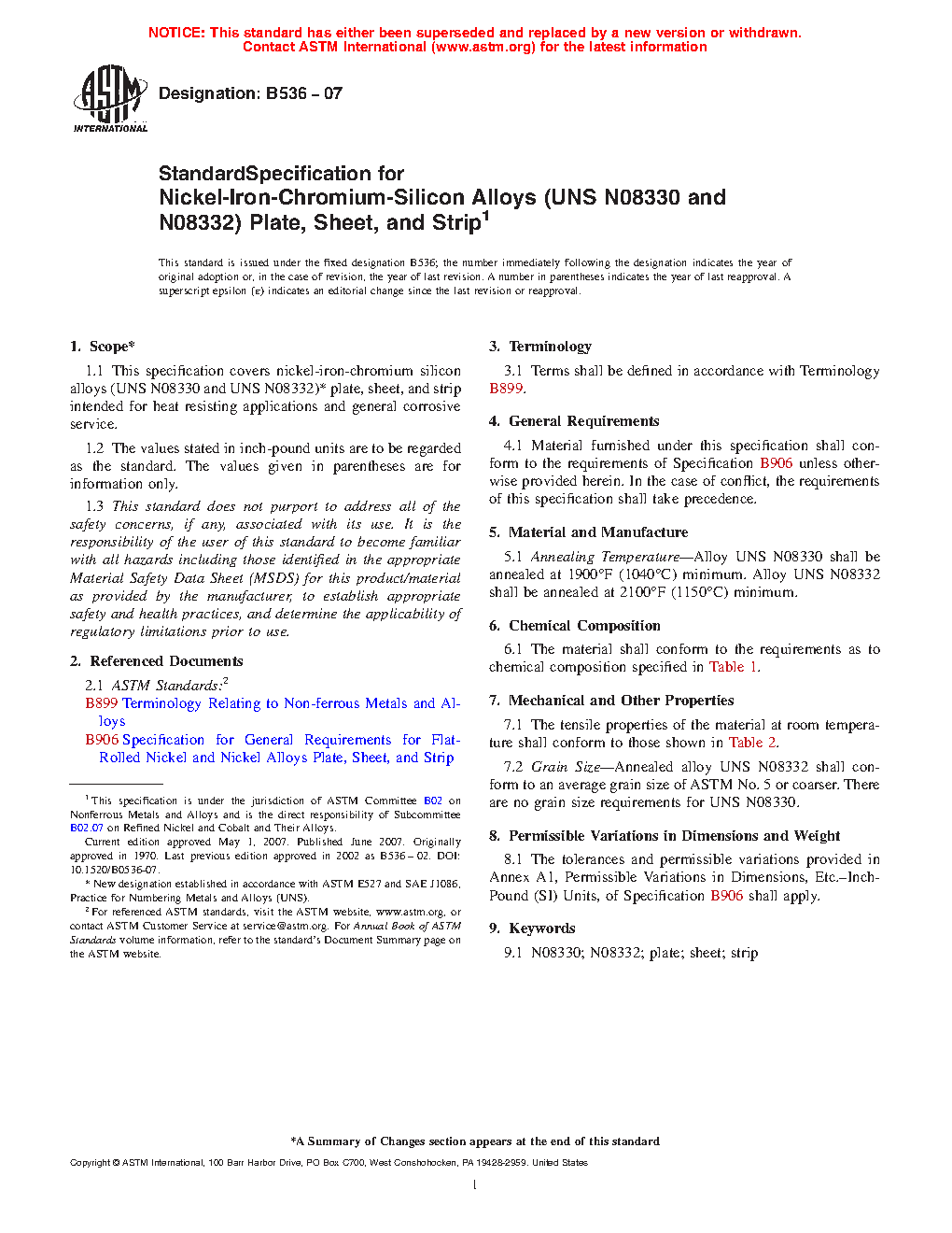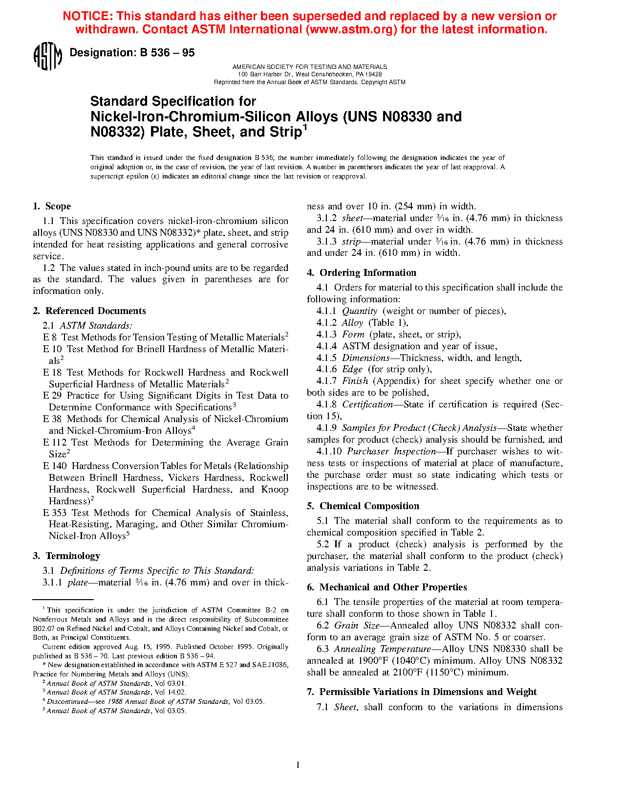 This specification covers nickel-iron-chromium-silicon alloys (UNS N08330 and N08332) plate, sheet, and strip intended for heat resisting applications and general corrosive service. The alloy UNS N08830 and UNS N08332 shall be annealed at a certain temperature. The material shall conform to the chemical composition requirements prescribed by the reference material. The tensile properties of the material at room temperature shall conform to the reference material. The annealed alloy UNS N08332 shall conform to an average grain size, there are no grain size requirements for UNS N08330.