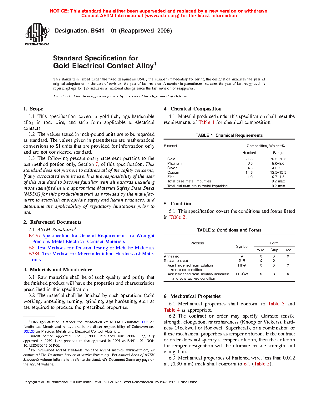 1.1 This specification covers a gold-rich, age-hardenable alloy in rod, wire, and strip form applicable to electrical contacts.