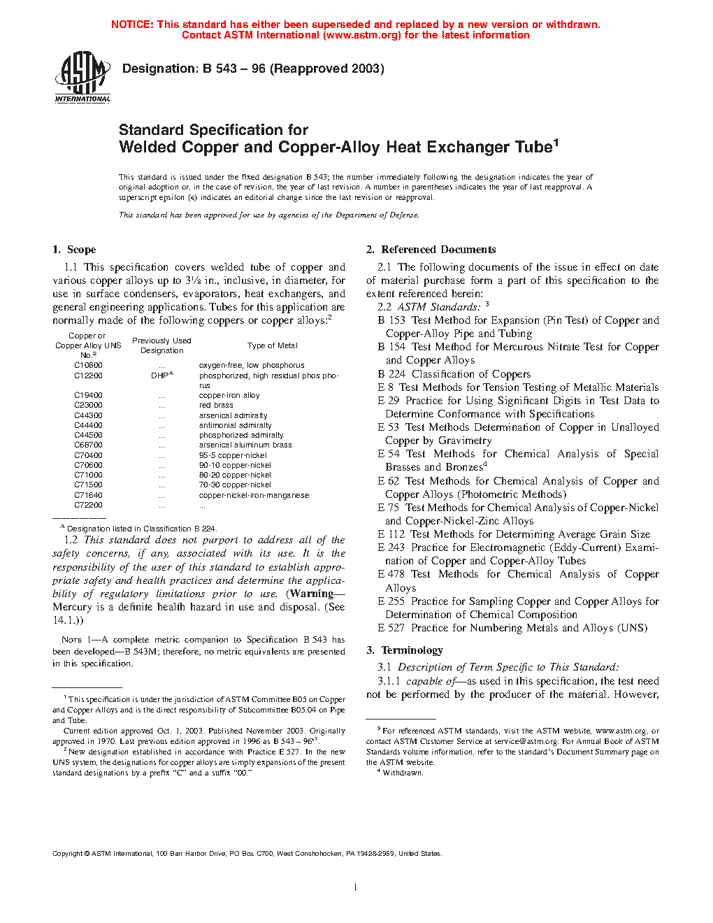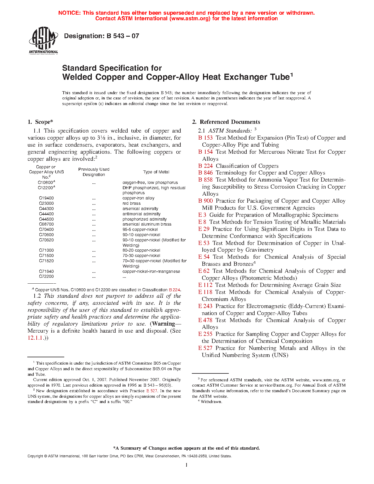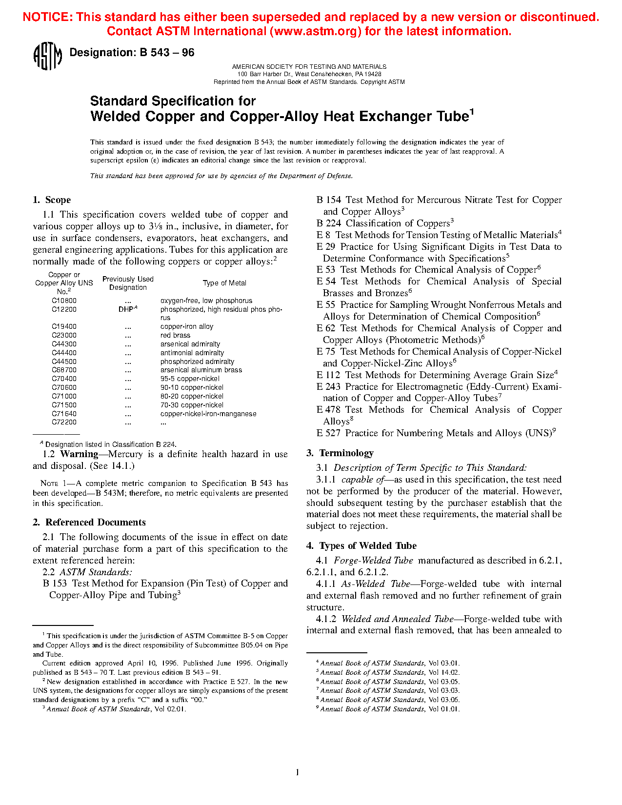 This specification covers welded tube of specific copper and various copper alloys of a limited range of diameters, for use in surface condensers, evaporators, heat exchangers, and general engineering applications. The product shall be manufactured by forming the material into a tubular shape on a suitable forming mill. Welding of tube shall be accomplished by forge-welding, fusion-welding, or full finishing that produces a forge weld leaving no crevice in the weld seam visible to the unaided eye. The tube shall conform to tensile strength and yield strength requirements, and shall be subject to expansion, flattening, and reverse bend tests. Mercurous nitrate or ammonia vapor tests shall be required only for selected UNS Numbers of Copper Alloys. Each tube shall be subjected to eddy-current, hydrostatic, and pneumatic tests.