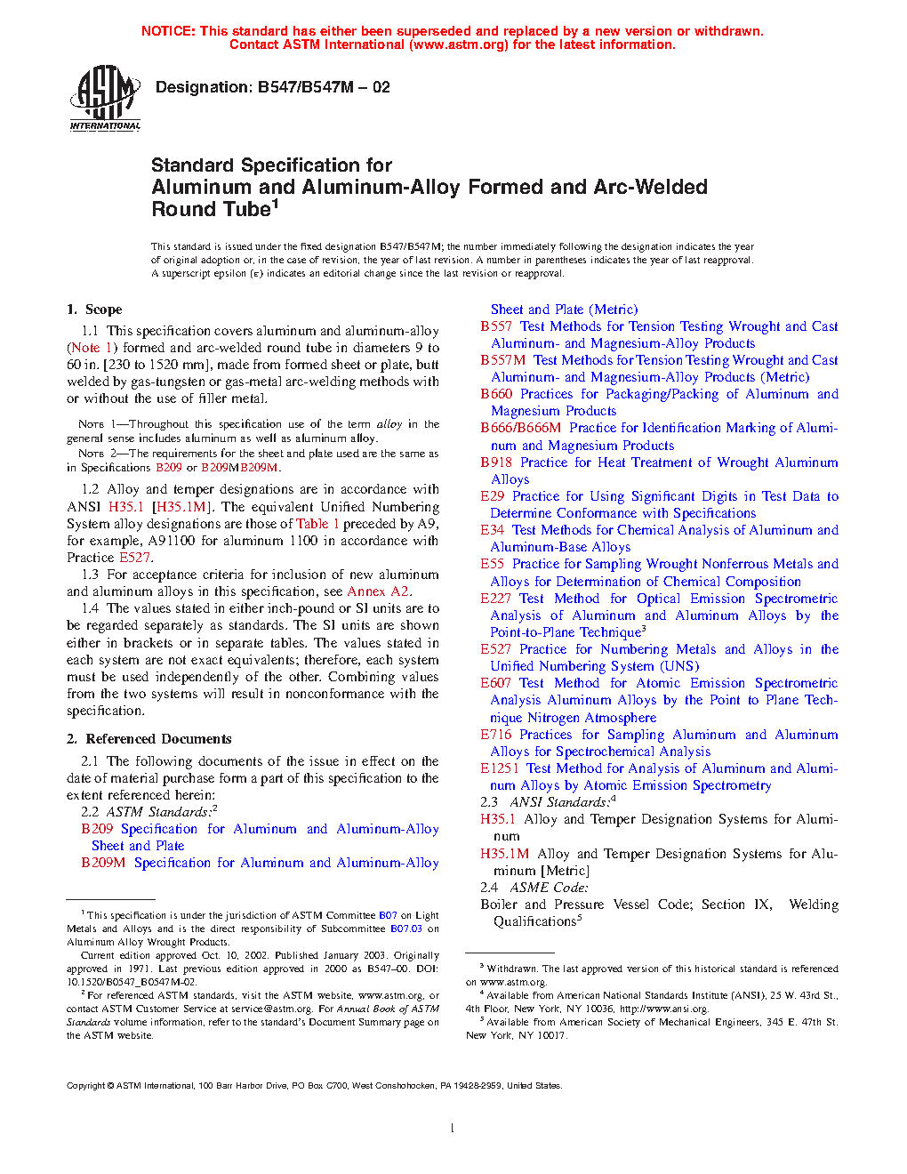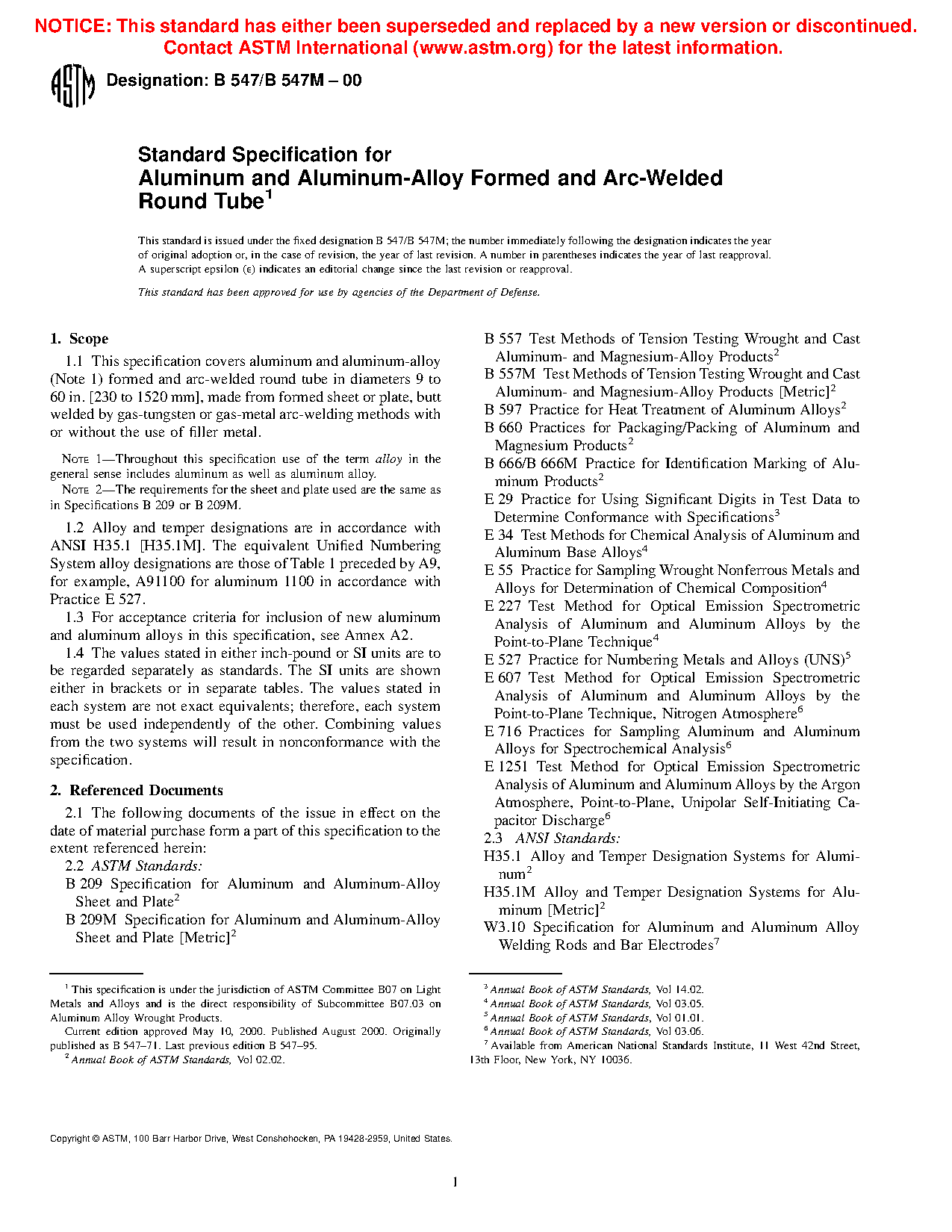 1.1 This specification covers aluminum and aluminum-alloy (Note 1) formed and arc-welded round tube in diameters 9 to 60 in. [230 to 1520 mm], made from formed sheet or plate, butt welded by gas-tungsten or gas-metal arc-welding methods with or without the use of filler metal.