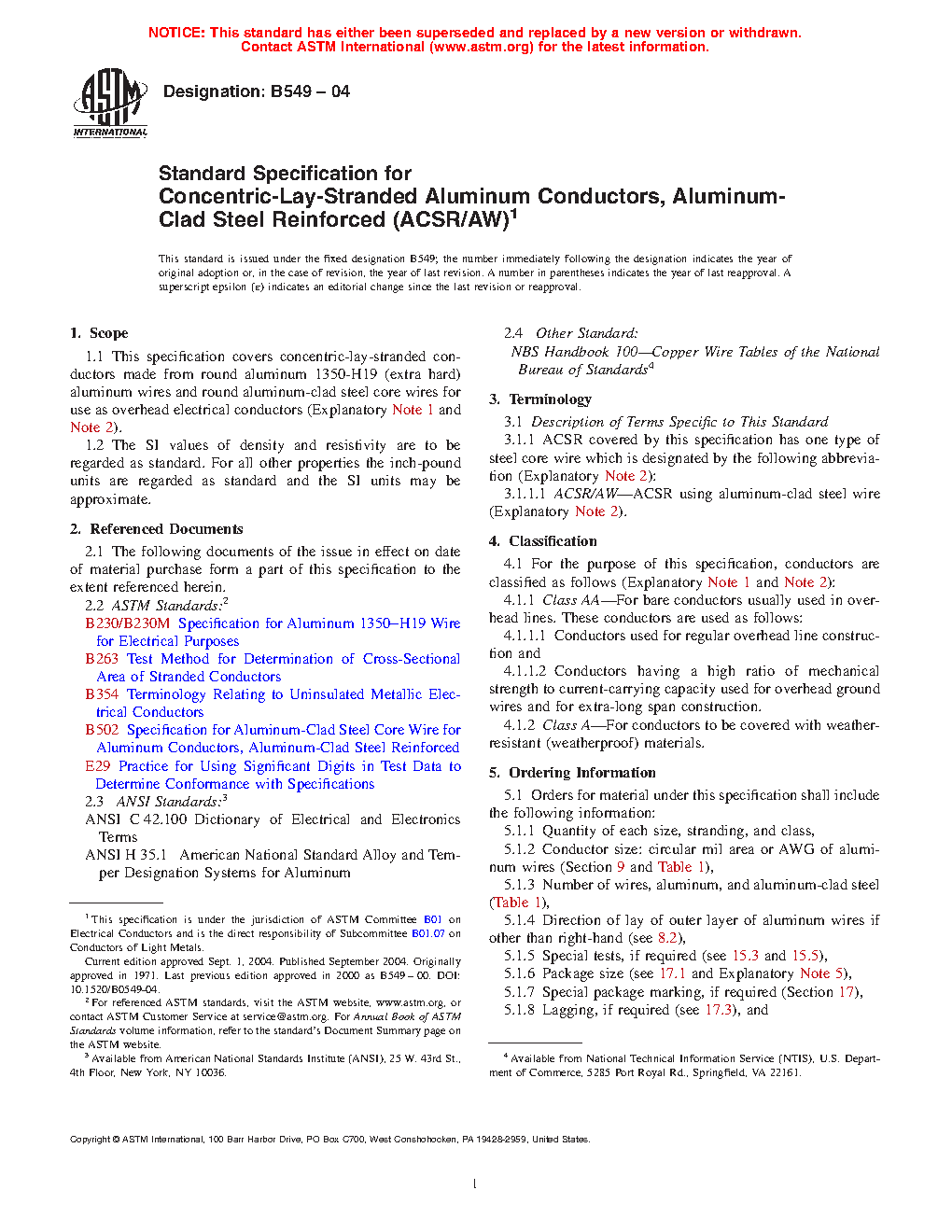 1.1 This specification covers concentric-lay-stranded conductors made from round aluminum 1350-H19 (extra hard) aluminum wires and round aluminum-clad steel core wires for use as overhead electrical conductors (Explanatory Note 1 and Note 2).