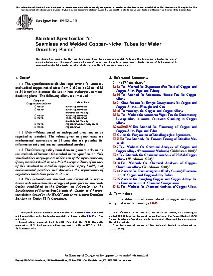 1.1 This specification establishes requirements for seamless and welded copper-nickel tubes from 0.250 to 2.125 in. (6.35 to 54.0 mm) in diameter for use in heat exchangers in water desalting plants. The following alloys are involved: