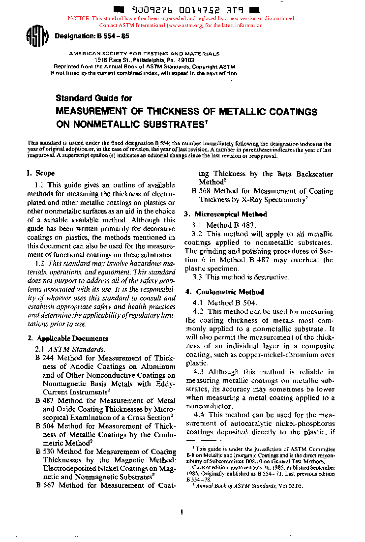 Recommended Practice for Measurement of Thickness of Metallic Coatings on Nonmetallic Substrates (Withdrawn 1986)