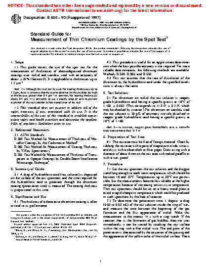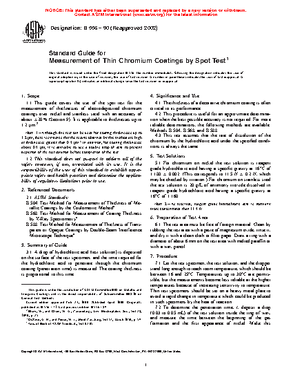1.1 This guide covers the use of the spot test for the measurement of thicknesses of electrodeposited chromium coatings over nickel and stainless steel with an accuracy of about ±20 % (Section 9). It is applicable to thicknesses up to 1.2 µm.2